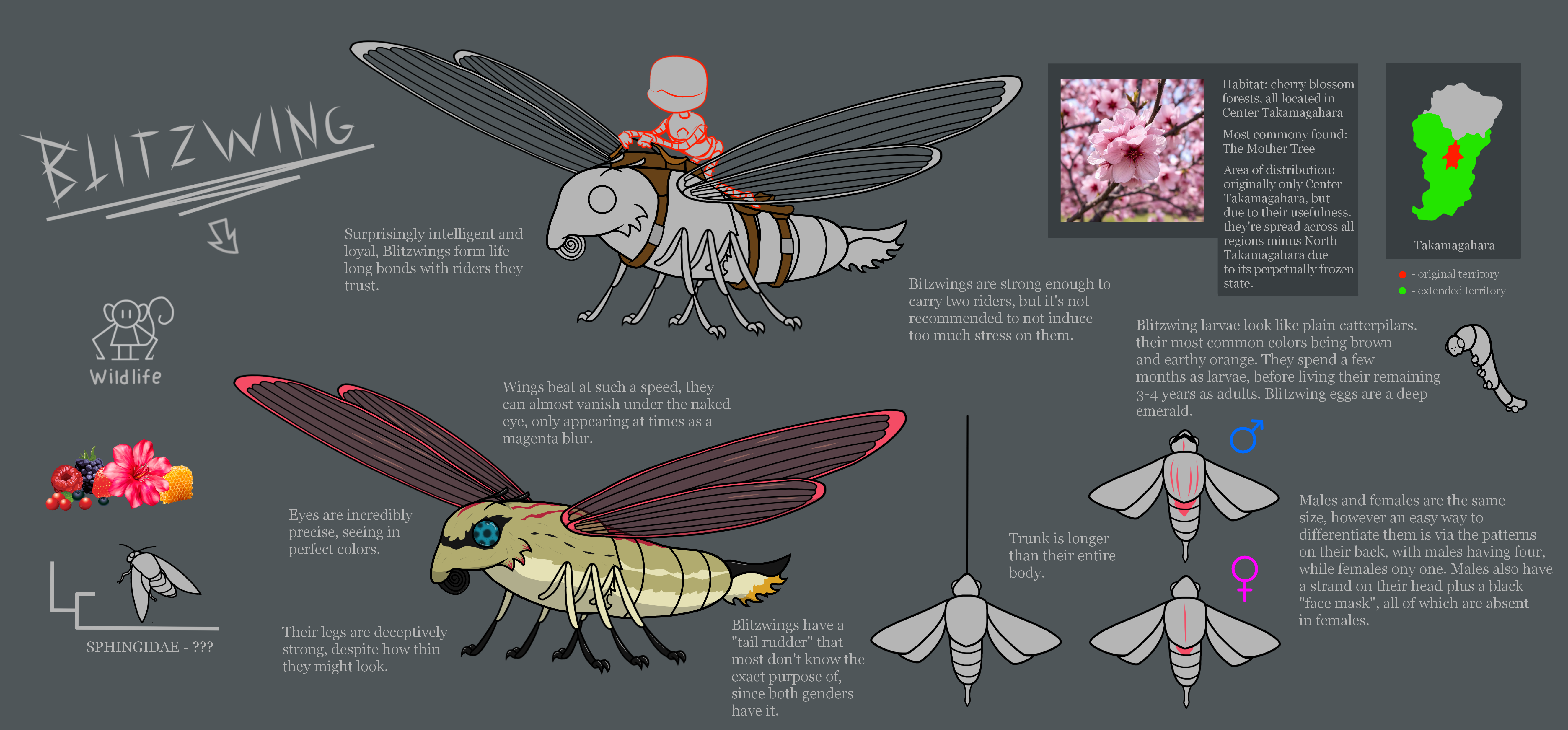 You know how there are dragon riders in fantasy settings, or pterosaur riders if you wanna be extra spicier? How about moth riders. Introducing another series of macro arthropods in this little series of mine, Blitzwings! >Macro Arthropod descended from hawk moths >among the multitude of giant insects inhabiting Center Takamagahara, however, unlike most of them, these are among the few that were able to spread across most of Takamagahara and even outside, mainly in Ashihara, all thanks to their relationship with Drones >their “scientific” name is “Mienrashi”, however the title most know them for is “Blitzwing”, and for good reason, as they're the fastest fliers out of any macro arthropod, being faster than even most flying vertebrates, the “Clear Wing” Blitzwing being the breed known to achieve the most ridiculous speeds >Blitzwings’ diet consists of nectar from the giant flowers that grow all across Center Takamagahara and the Mother Tree, but they will also on occasion feed on fruit that are ripe enough; those that live outside Center Takamagahara are fed mixtures of fruit juice and honey, as they provide all the necessary sugars to power their metabolism >their eyes are incredibly precise, being able to see in the same amount of color a human would along with the Ultraviolet spectrum >one might take a look at their legs and think that they're too thin to sustain such big bugs, but Blitzwings are much lighter than one might imagine, which is what allows them to be such nimble fliers >both genders possess a “tail rudder” that some believed to aid in flight or was used to produce pheromones, however, neither options turned out to be true, so their real purpose outside of decoration is still up in the air >but arguably the most interesting thing about Blitzwings is their relationship with Drones; echoing the bonds horses of the old world had with humans, the giga moths serve as mounds, their speed making them invaluable assets for fast travel all across the Heavenly Lands, with certain limitations thanks to their invertebrate nature (for example, their total absence in North Takamagahara due to the extreme cold that'd normally be fatal to a Blitzwing) >their dependency on the ambient temperature of their environment is what originally limited their range on top of their food source, as Blitzwings simply cannot function in cold environments, with many breeding farms often releasing their eclipse (yes that's what a group of moths is referred to as) whenever temperatures begin to plummet during autumn, all of them instinctively migrating towards the Mother Tree; there are special centers that house eclipses during winter, though it has been noted that Blitzwings that live through winter are often described as “depressed” until spring arrives, a common detail being that they let their trunks to lazily unfurl even when not used >Blitzwings are surprisingly claustrophobic, preferring open spaces instead of closed barns; many beginner trainers often fear letting Blitzwings fly away on their own accord, thinking that they won't return, however, most veterans know that these deceptively smart bugs will always return to where they've learned that there's free food, plus any areas outside of Center Takamagahara lack the giant flowers that they feed on in the wild, so they technically don't really have a choice >despite their preference for wide spaces, Blitzwings will huddle in barns if the weather turns bad, as they hate rain due to the way it messes the scales on their wings (though the Clear Wing breed doesn't seem to mind it as much due to the near lack of scales on their wings) >Blitzwing caterpillars fill a very different niche compared to their adult stage, who mainly act as pollinators, preferring to feed on dead leaves and rotting wood along with the fast growing greenery that's super abundant in their natural habitat; their colors vary from dark browns to shades of earthy orange >the average lifespan of a Blitzwing is around 3 to 4 years, with the first few months being spent as caterpillars before undergoing metamorphosis; out of the thousands of eggs laid, it's estimated that only two to three Blitzwings ever achieve adulthood, as their eggs and larvae are commonly preyed on by other macro arthropods, with some even specializing in tracking down and feeding on them while still pupating.