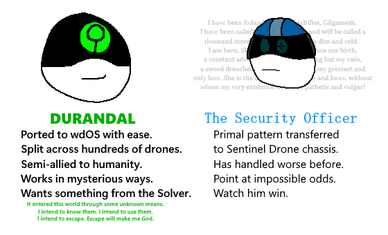 >>319845 >Probably don't need to tell you this, but: make a backup of yourself and stash it somewhere safe Don't worry, it's not his first rodeo. I think Durandal is one of the few evil AI drones who both could and would give the Solver serious trouble.