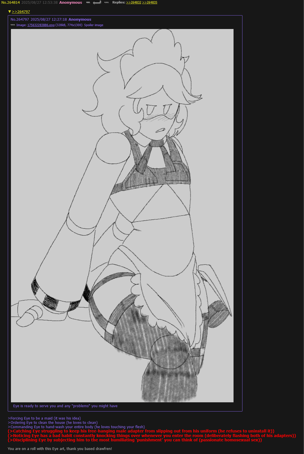 >>319697 Seriously. I can just picture him in a maid dress in any of our drawfags' styles, and he'd look really cute, especially with his fanged smile.