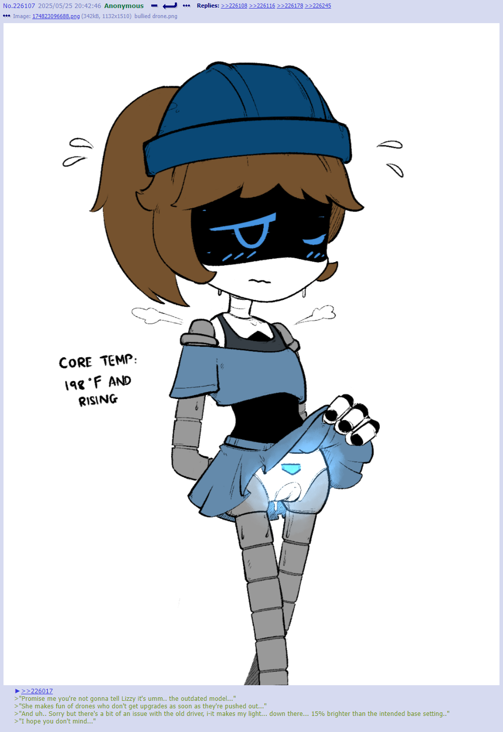 >>320812 >Pavo gets sent a story about him having steamy yaoi hatesex with a short, angry DD >He's quite offended >While discussing this offense with Techanon, he realizes he knows that drone- they're in a book club together >"Crazy, vitriolic guy. But he gives great book recommendations during his rants," Pavo comments >"And his... model doesn't bother you?" >"He doesn't act anything like a murder drone, Anon. He respects life. When he's not ranting about humans being idiots, that is." >"Right. So, how real was the scenario in that, uhh..." >"Oh, PLEASE. I've got zero interest in him. Besides, that story was bargain bin enemies-to-lovers trash." >"You're an expert in the field, I take it?" >"Sappy fanfiction is one of the purest expressions of human emotion. Not so much writing quality, I'll admit." >"Ever written some yourself?" Anon asks, and Pavo blushes slightly >"A little bit, here and there." >"You should show it to me, so I can read it out loud," Anon taunts >"N-nope! It's bad, Anon. I'm ashamed of how bad it was." >Anon nods, then stops, staring Pavo dead in the visor >"It's all self-insert robot-on-human romance, isn't it?" >Pavo stares back, a buffering icon flickering in and out between his eyes, before he mechanically turns and lies down on the couch, switching to SLEEP MODE >"You do not fall asleep that fast, Pavo. Take off the fake display." >Pavo starts up exaggerated snoring >Anon rolls his eyes and leaves >He quietly opens up an ancient fanfiction site, fiddles with it until he remembers his old login and password, and looks at the story he wrote decades ago about his self-insert getting a job at Ladytron's and gradually developing a relationship with the mascot robot who worked there >Awful, hormonal writing, nonsensical plot hooks... an oddly detailed and intimate 'degreasing' sequence where one would expect a sex scene... >He couldn't delete it. Deep within, his inner child still held a candle for a buck-toothed robot chef.