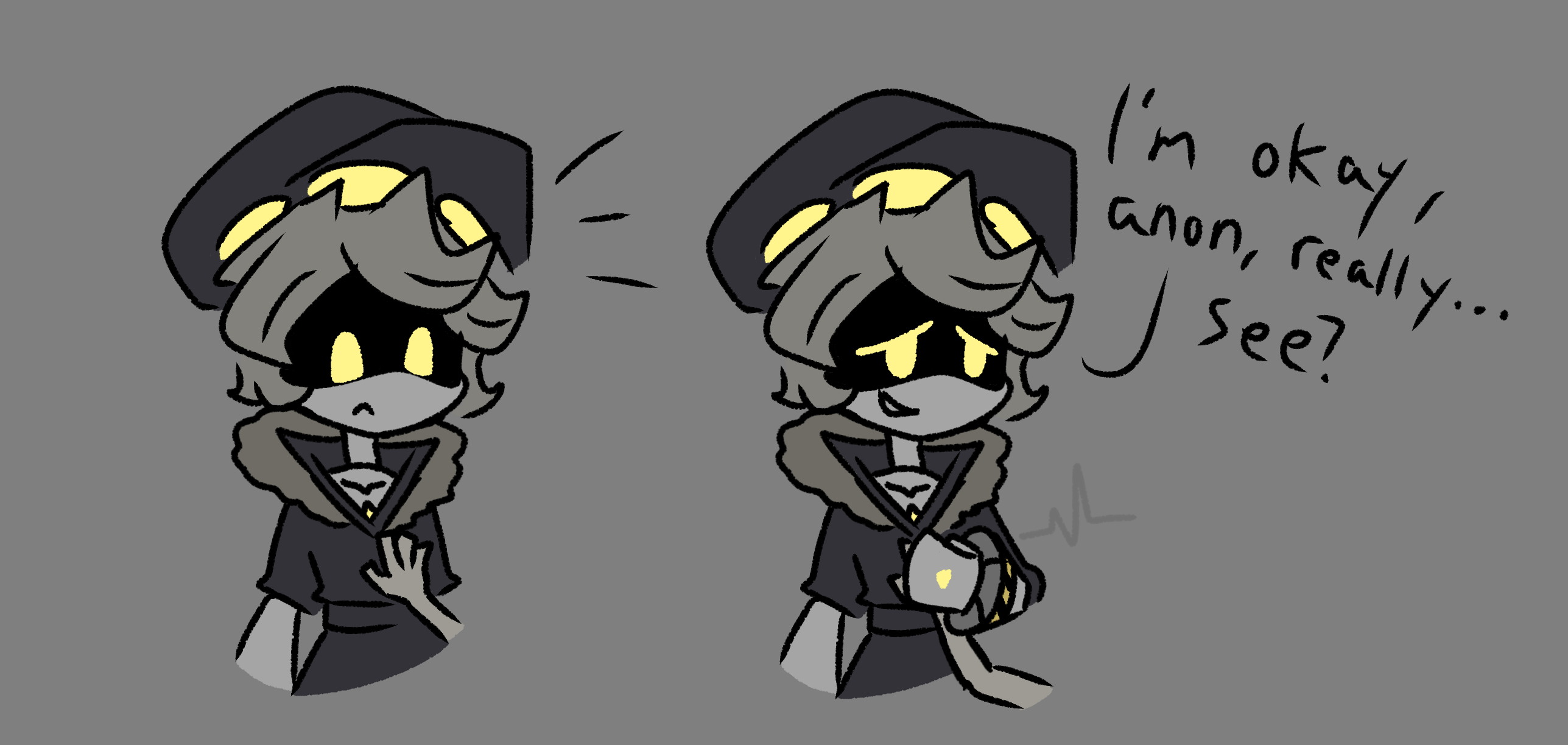 >>320959 >Be you, Anon. >You and Teli end up taking shelter from the rain together. >She wore her cute white hoodie and you want to complement her but... >It’s been a long time since you last spoke to her. >You used to be very close, she was your first drone friend. >Eventually, though, you grew a little tired of her clinging antics and terrible hygiene. >You could have stayed closer, but now she’s just… there. >You were always more interested in the doctor drone anyway. >She stands quietly beside you, the rain falling softly, a drop of water on her visor. >“So… Anon,” she says, hesitating, “you and Felicia are… a couple, right?” >“What no, where did you get that idea...” >A part of you wish this was true though. >She pauses. “Ah… have you ever kissed her?” >“Why do you want to know that?” >“I just… I need to know.” >“Promise you won’t get mad.” >“Oh, it’s not like that,” she says quickly. >“Anon I just… wants to know, that’s all.” >You feel relieved, if only for a moment. >For a second, you thought she might actually have feelings for you. >But what if she does...? >“…No,” you admit. “I haven’t.” >“Oh.” >Teli steps forward slightly, still avoiding your eyes. >“I’ve kind of noticed that… but you know, we’ve held hands, and...” >“Ah…” >“And I’ve been puzzled for a while.” >She giggles softly, trying to lighten the mood. >“And thanks to you, I've been going out more...” >"I only wear this stupid bunny costume to feel more confident. " >Teli suddenly shudders. >“What’s wrong, Teli?” >“Oh, haha, nothing, Anon. Nothing at all… so you… love her?” >You hesitate, then whisper, “Yeah. I love her.” >Teli looks down and sighs. >You hold out your palm, letting the rain hit it. >“Well, it looks like the rain’s letting up. I’ll see you around, Teli.” >She smiles faintly at you. >“But hey, Anon?” >You start to walk away. >Teli takes a deep breath and whispers to herself. >"You did it, Teli. You didn’t cry in front of him. You’re going to be okay." >“Oh! By the way, Anon!” >You turn back. >“I almost forgot, I got you this.” >She hands you a small box of sweets. >“I remembered they were your favorite. Forgive me if I'm not the best baker.” >You stare at her. “Teli?” >"it's nothing, don't worry about it." >As Teli got to her apartment. >Tears well up in her optics. >“That’s not fair, Anon…” >“That’s not fair!”