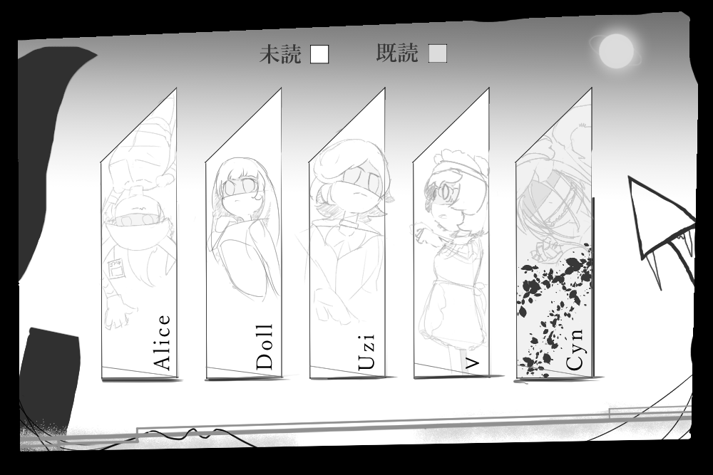Decided to fuck around in between other projects, wanted to make a sketch of how a character/route selection screen would look like if an MD visual novel was a thing. If you finished a character's story the little "card" would also change art depending on what the fuck happened there. I wanted to show Alice hanging upside down but then realized I've never fucking tried a pose like that, maybe another time.
