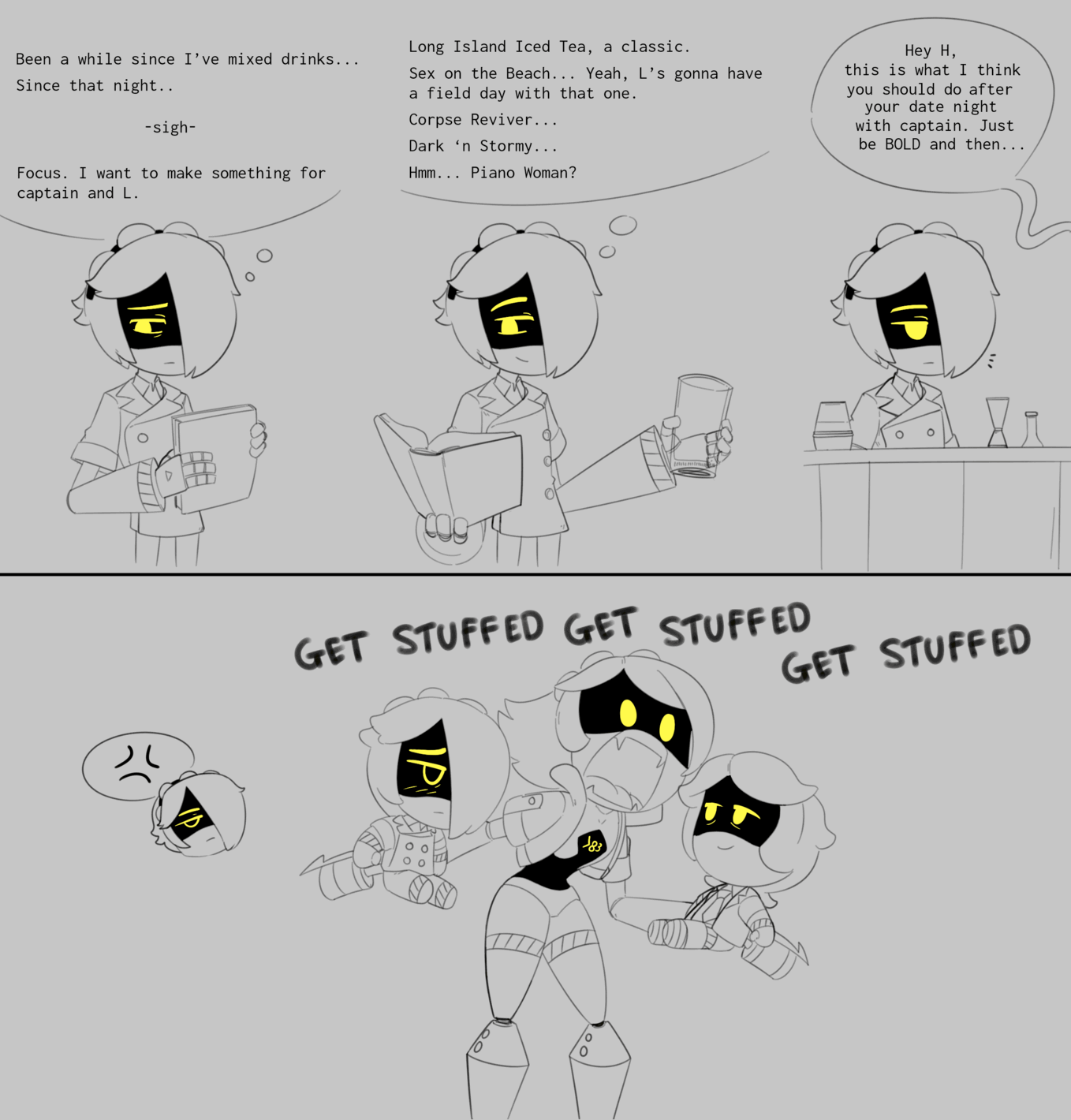 I think I should ask this question here too: how would you spend a date with a drone you liked, anon? I'd invite Pavo to eat at my home since I'm a good cook and don't like restaurants(I've worked in a couple, and anon, it's a lottery with cockroaches as a prize), and I'd ask him what he likes so I can make him more than a can of oil and batteries.