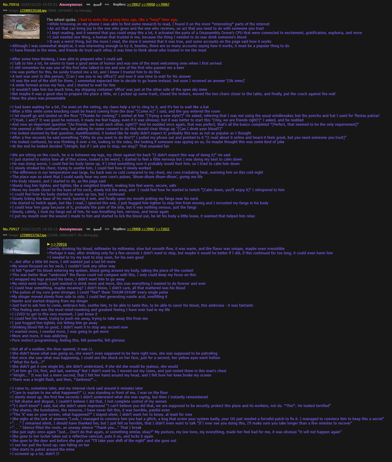 >>321419 I think that disassembly drones should be predatory but they are people and animals. Like your dd gf might like to nip your cock while she sucks you or she like stalks you etc.