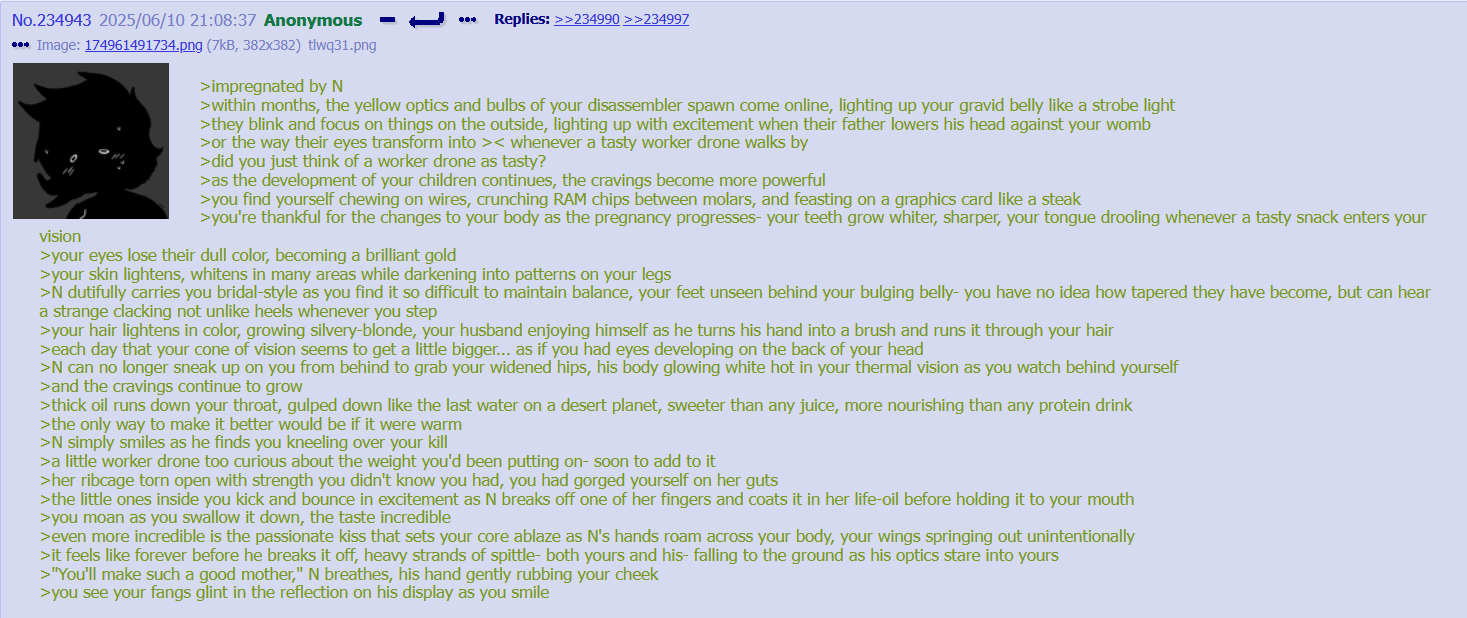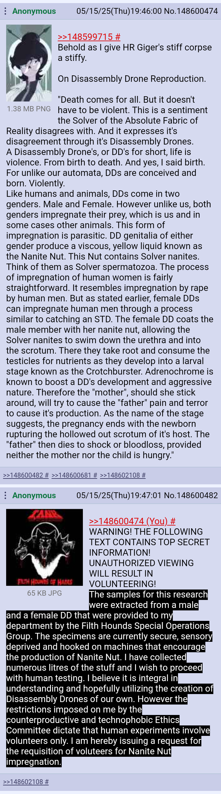 >Post good ending >DDs are sexy by design >People want to have sex with them >DDs are no longer trying to kill everyone >People approach them for sex >The DDs are happy to comply, because Cyn imbued them for a craving for human "connection" >Sex is about to happen >The humans run away screaming >Female DDs have monstrous vaginas >Male DDs have monstrous dicks >DD reproduction works by the DD penis having inbuilt weaponry such as razors or retractable spikes so that it can wound or kill the DD vagina, temporarily stopping it from trying to kill the male with acid and spines and stuff >Turns out that the humans were unaware because during the war the DDs would fuck people dead, leaving no witnesses to report on it >V and E turn to gluttony to compensate with their unfulifilled urges for human cock >L is extremely frustrated >She took a human home >She spread her legs, showing him her hellmouth >The human screamed >L panicked >She formed a gun and shot herself in the cunt >"There! It's safe now, see? Now for the love of robogod, put your dick in me!" she said as she pointed at the bloody mess >The human looked at the wound, screamed harder and ran away