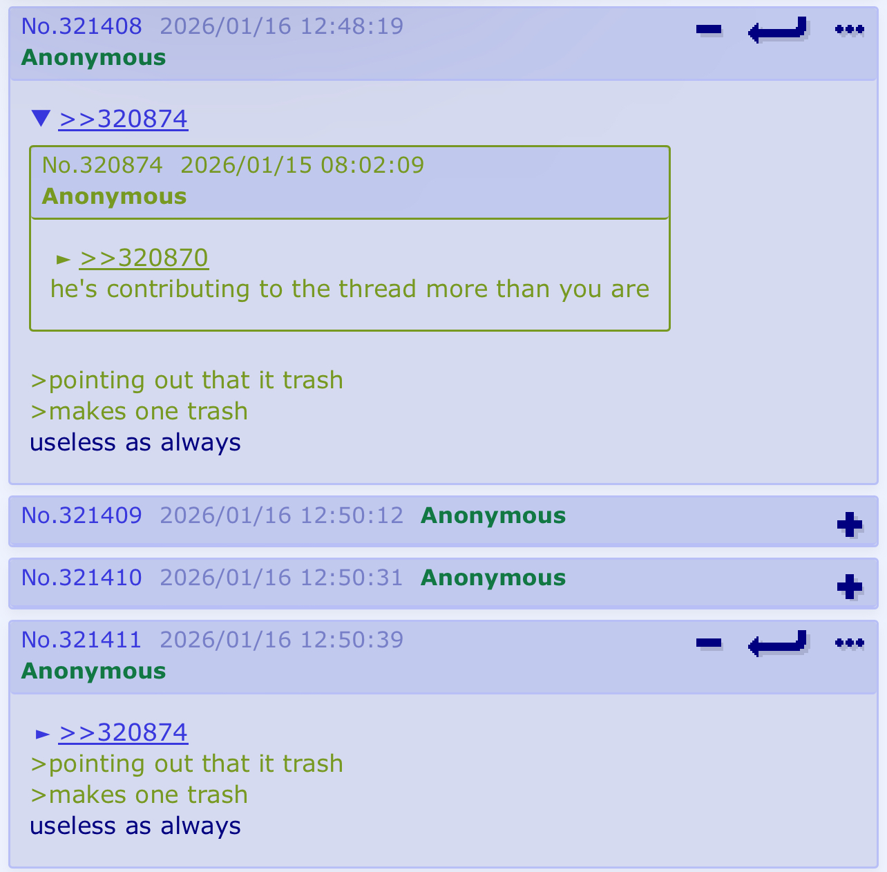>>321139 In fact, we haven't had a single, shared idea for a long time about what keeps threads going for a long time. Now, we mostly just go with the flow, occasionally briefly discussing a small things.