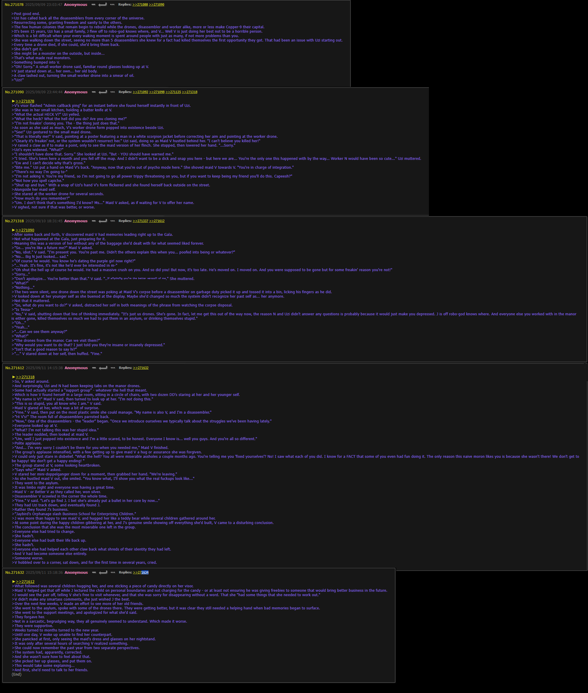 Other places stream movies. Some do puzzles, or run tournaments, or join in multiplayer games sessions online. On /a/, they all get together and record themselves singing the opening soundtrack to their chosen show. It’s great stuff. Nobody even streamed the MD finale when it released, nobody opened up a rewatch for it, it just came and went with no cultural memory. The drawpiles are the only thing that we have, no minecraft server, nothing. Most drawfags don’t act like anons, they have tangible offsite presences and maintain other interests outside of Murder Drones, it’s part of the reason why they also don’t interact more, considering how parasocial things can get. Thread anons like to assume the worst about their conditions, assuming they’ve left, lost interest, or have had some misfortune occur IRL.