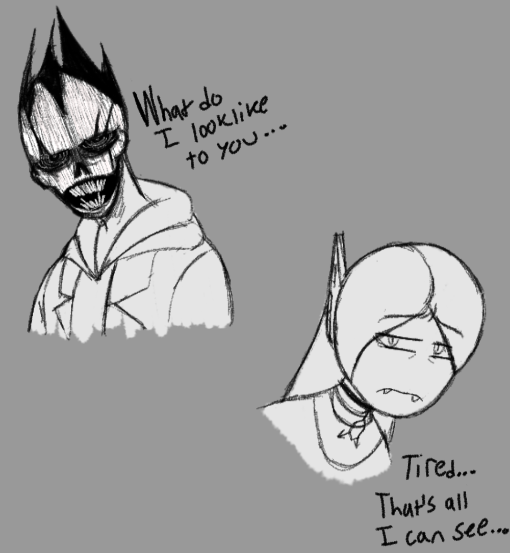 A John and Hilal green >"What do I look like too you?" >...That was the question that John ask Hilal >He seen her around a few times with Beretta and them. Especially around Cyn. Though reserved she's kind and well mannered >Though.... >Anytime he tries to talk to her...she always remained silent. Distant. Always a sad expression everytime he talks to her >So one day...he confronted her. Asking her why she always give a sad expression when he's around,why be so distant and silent, why treat him with such...Pity... >Hilal didn't say much when he first ask...the air was deafening as both of them stood there as trees in the forest...till eventually she spoked >"I can see what a being is like. Measure how they are, see what they truly are deep inside. Sometimes it's an animal. Sometimes it's a weapon. And sometimes things that are other worldly...I react and respond accordingly for this is nature and within nature there's a hierarchy" >"So when I see uzi, all I see is nothing but a meak bird...but when I see Ms.Cyn...I see nothing but a great maul ready to consume everything and so I bow down...but you...John...all I see is nothing but broken...Ms.Switch told me about your conversations that you have with them" >Thus brought back John to his original question:"What do I look like too you?" >Her response tooked him off guard not because it came from pity or sorrow...but...love... >Hilal:"Tired...That's all I can see from you John...and you deserve to rest...you been awake long enough...and Ms.Switch knows that too" >Hilal:"So please rest..." >John:"...I cannot..." >Hilal:"Why...why keep yourself awake for this long..." >John:"...there's an old song that I know of...it goes like this: "You can run from your demons until you are exhausted One day you will have to stop and find out what they wanted"....So I stop and I'm still waiting for my demon to come and give them what they wanted..." >John:"....nothing more...nothing less..." >She didn't say anything but gave that sad expression >And behind those eyes was nothing but hearbreak >Not because of the truth that he told her but instead the fact that she couldn't help him >No solution she can think of to help John rest...No wonder why before she departed she gave him a hug...That marks the second person that John didn't budge nor fight back upon when giving him a hug