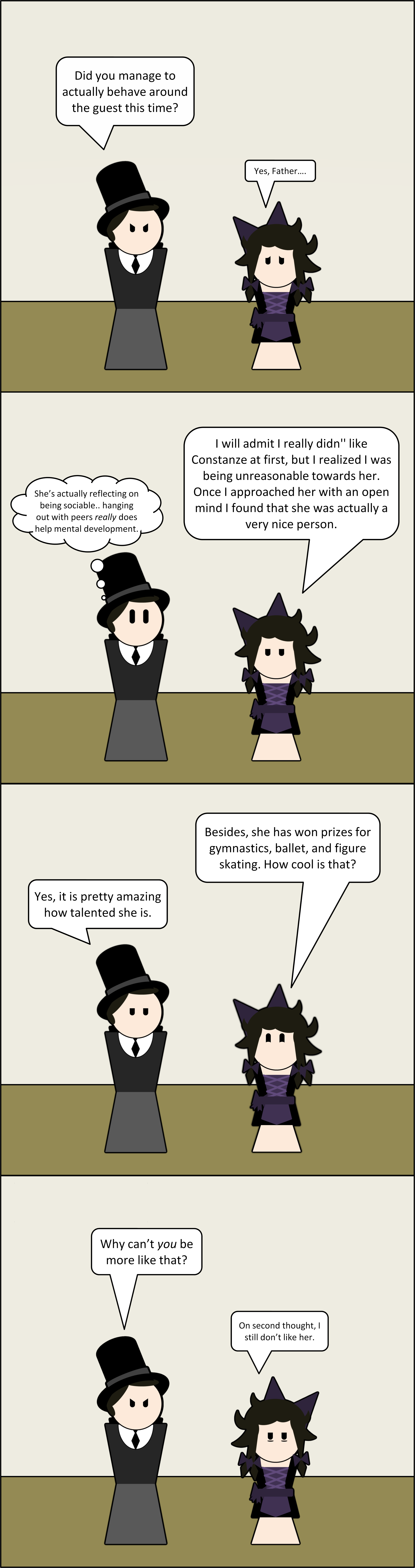 >>322136 Constanze's parents are the complete opposite of Tessa's. They sincerely love her and will always support her, no matter what she decides, becous they trust her as a healthy and fulfilled person. That's why Constanze, unlike Tessa, has become not a fetishistic Satan costume, but a standard-bearer for humanity.