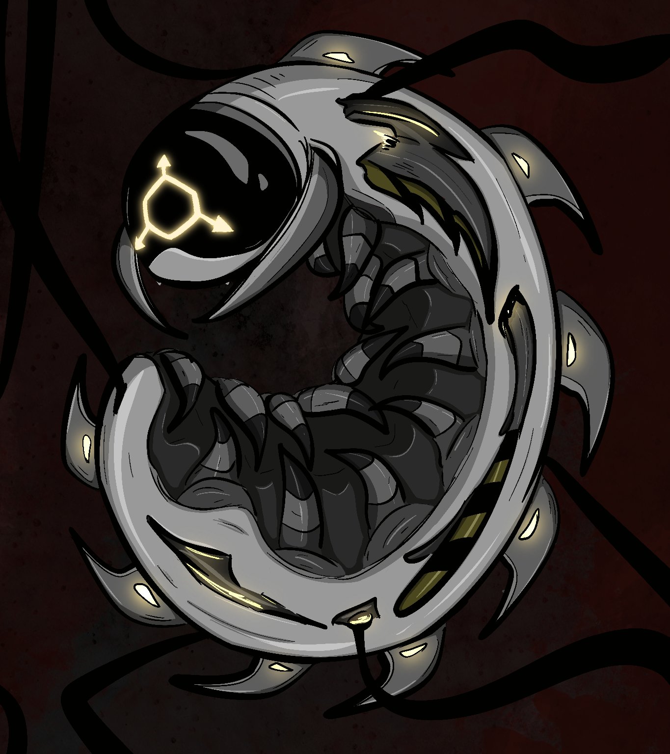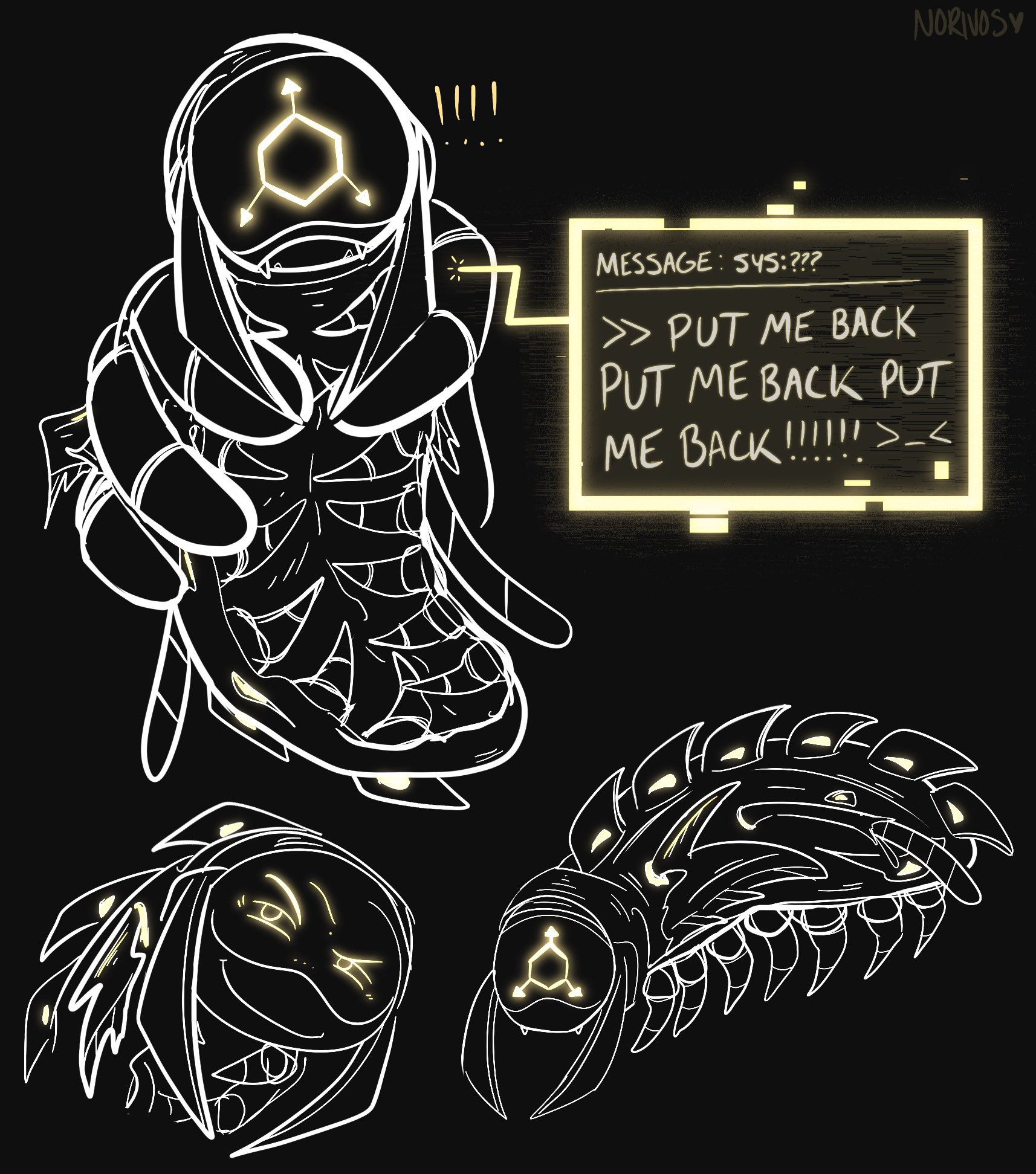>A WD solver host and a DD can have a spawn child that takes the shape of a grub (similar to a grub beetle) >This horrendous spawn can grow into a strange mix of WD and DD >Or it could be a terrifying solverpede creature. >Uzi was pregnant with one of these spawns but she decided to commit abortion by coathanger, but it did not work well. So N had to do a harsher or clean procedure...