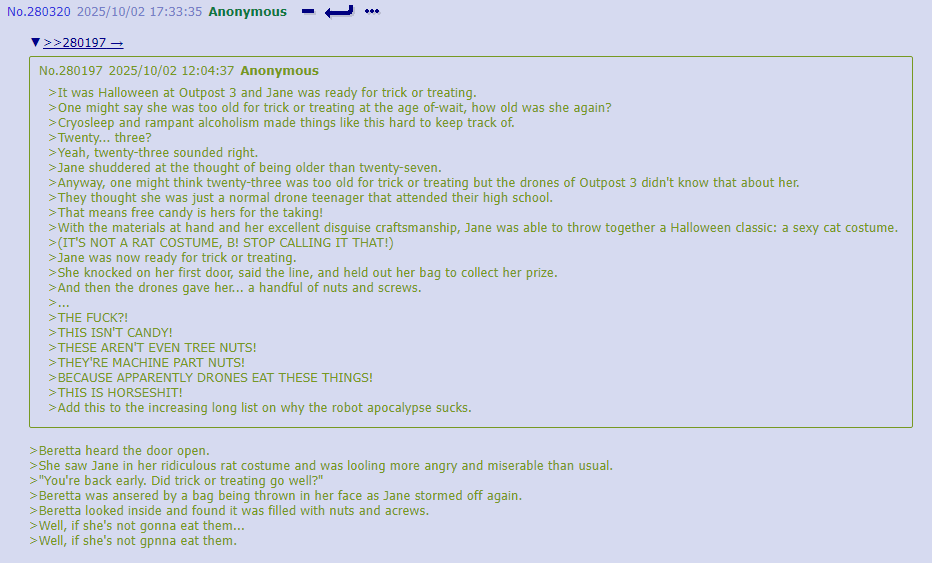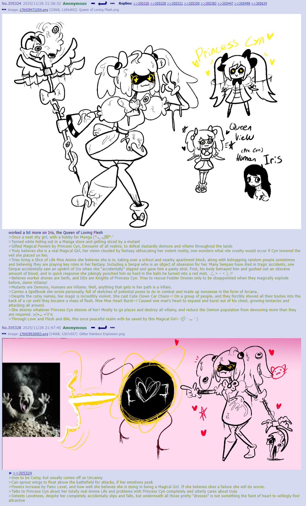>>322853 Well, I wrote Elf green because one anon mentioned her and it sparked a desire in me to write. I think we just need to remind about old characters sometimes, so that anons remember them and, if they want to write something, use them.