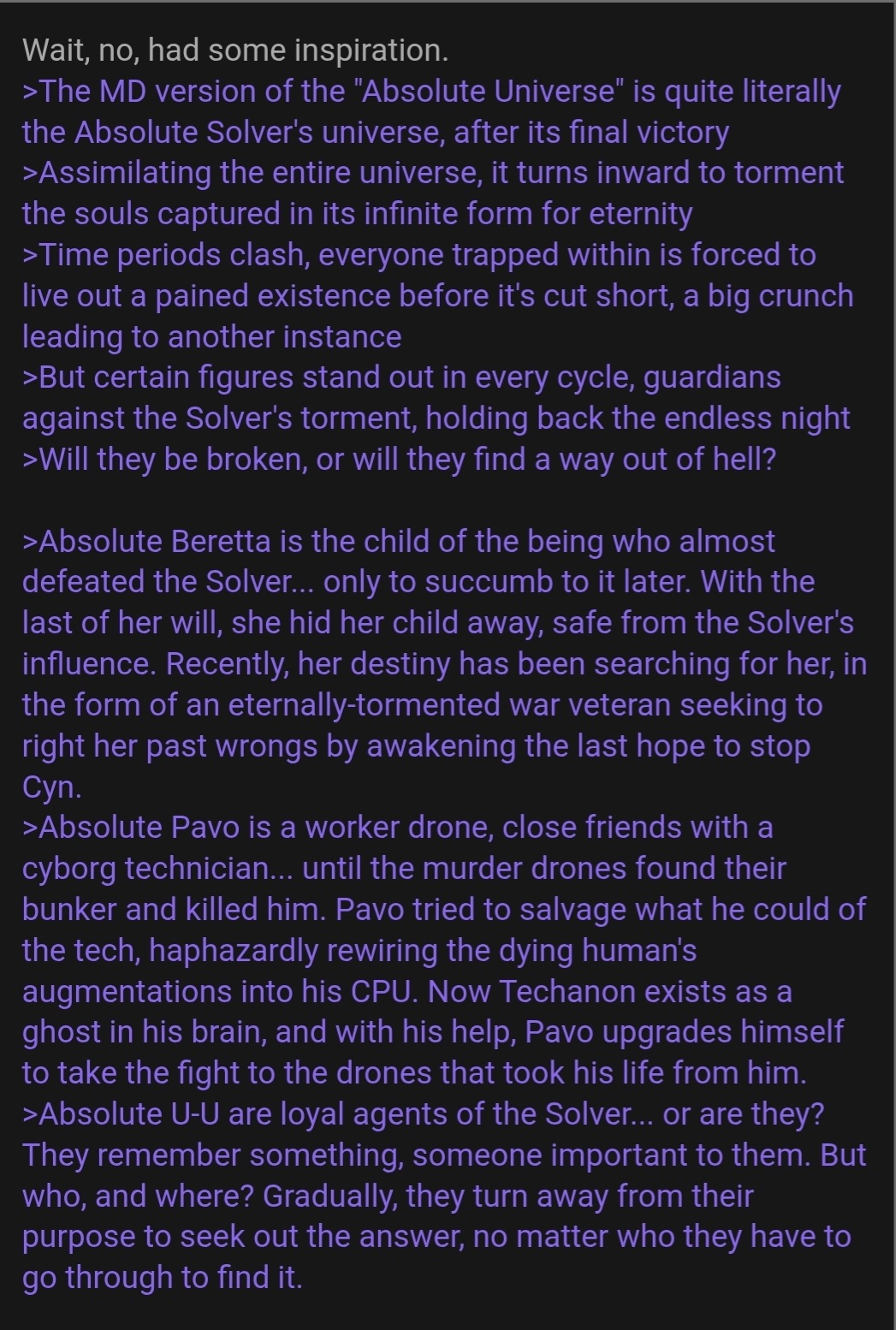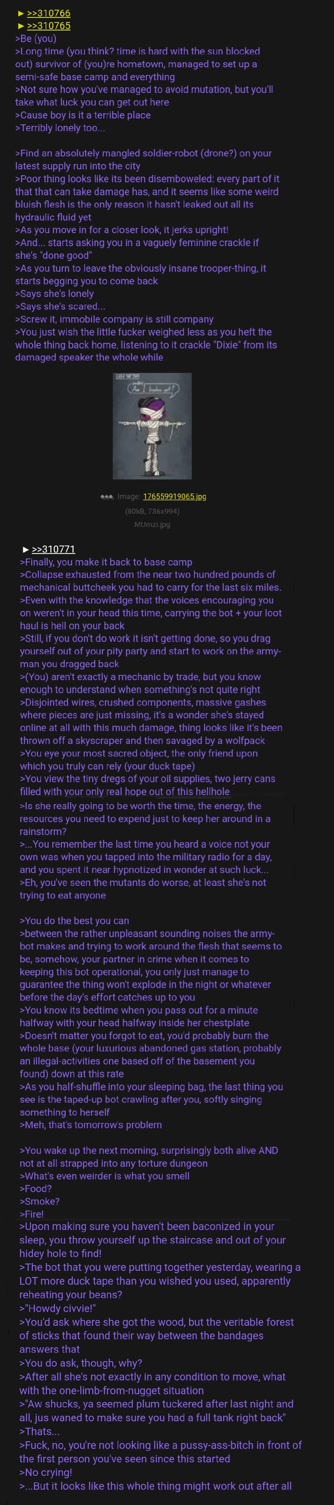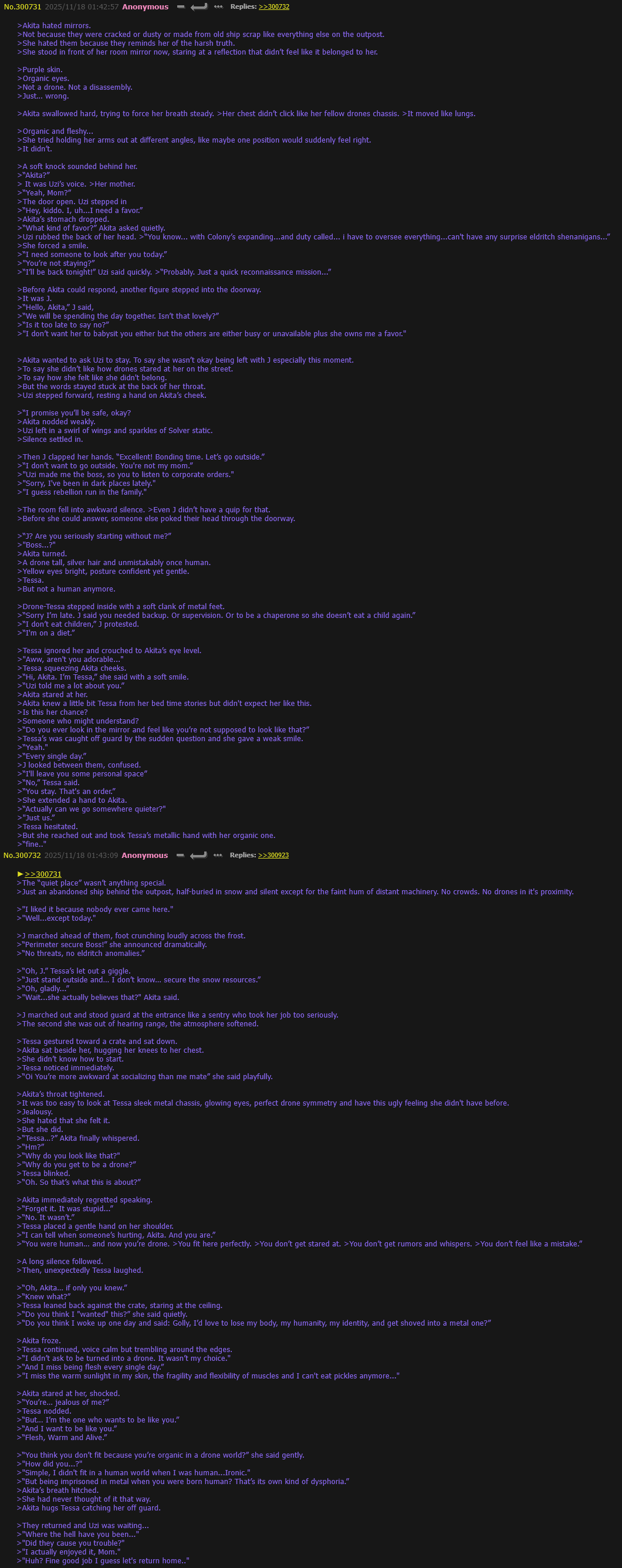 Chuuni Uzi : Intermission (I lost count) >>319754 >>311330 >Be Tessa (Barely out of the shower) >You watch the video feed of your command console cut off >The last frame stays in your mind for a while >Your purple whale with a white chassis >And the blue eyed drone behind her >A Disassembler chassis >None of the technicians reported anyone under their command going AWOL >So they had to steal one and upgrade one of their own >Crafty… hopefully they didn’t get their hands on the drivers for that hardware >And worst of all they got Anon… >You must admit, you folded easily >The planet is under a strict cordon >Ships get tipple vetted to enter or leave, any transmissions that aren’t JCJ get turned into garbled noise >But Anon looked to be in decent shape so hopefully there is no need for MEDEVAC >You can’t allow any of your technicians to get hurt >J reminds you of the cost of a single medical team intervention out here at least once a month >They outer rim markup is ridiculous >And also… >Why him!? >Why not you!? >You would be so close to that cute purple drone! >That lucky bastard Anon gets to have a whole colony of drones to himself! >And you’re out here with only your squad! >Sure you love them like anyone would love their family >But… you want more >You look at J >”Trace that call” “Already on it boss” >”Alright, when you do tell D’s squad to check Anon’s lander and the signal origin” “And our part of the bargain?” >”Uhh… Tell the other technicians to take the next two weeks off, and their teams to never take their optics off them” “And if they ask about Anon?” >”He’s… uhhh… sick, got a nasty fever from going out in the cold while drunk” >J starts sending out the messages >“Oh one more thing, make sure those two weeks burn any unused paid time off they have” J smiles, you can see pride in her screen “On it boss!” >You go back to the bathroom to dry yourself and change into your work clothes, you’re still wrapped in towels and dripping water onto the floor >You leave the bathroom >J has sent out the messages and begun mopping up the puddle you left >You sit down near your table and begin thinking up some plan >Some time passes >Squad D is here and ready to give their report >First you come talk with D >”How is Anon’s lander?” >D looks absolutely furious “It’s gone! Ane big blood crater is aw that’s left! Thae bloody mongrels blew it up! A swear I’ll stick me fingers i their screens an…” >D continues to put and swear vengeance, paying little attention to anything else >You turn to the rest of her squad >“You guys found the source of the transmission?” “No boss, the signal was spread all across the city, all we found were these pieces of scrap” >SD-I hands you some weird boxy machine >“Nothing else?” >I attempts to respond but U-U begin talking over him “No! And this is all I’s fault!” >I tries to protest “My fault!? How!?” “(-U)You should have been with Anon and D when they were getting that supply crate!” “He told me he didn’t need the extra help! And to go hunting instead!” “(U-U)And you know our technician is a pendejo!” “Oh yeah! And where were you back then!?” “(U-)We were on a secret mission! (-U)And we won’t tell you more because you weren’t chosen!” >U-U begin blowing raspberries at I >Right, they got you the maps of that weird laboratory on the outskirts on the city, you haven’t checked them out yet >You try to defuse the situation before U-U and I start fighting >D has also let off enough steam to help you with her squad >”Ok guys, let’s just all calm down, I’ll think up of some way to get back Anon, until then you’ll be staying with me”