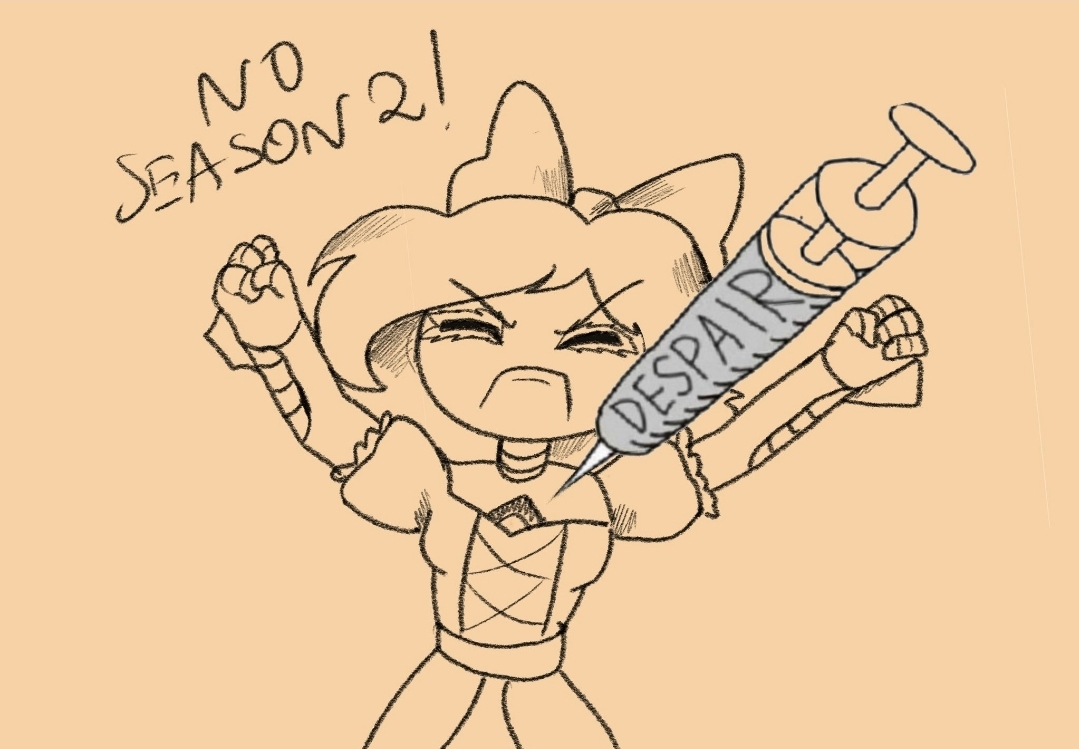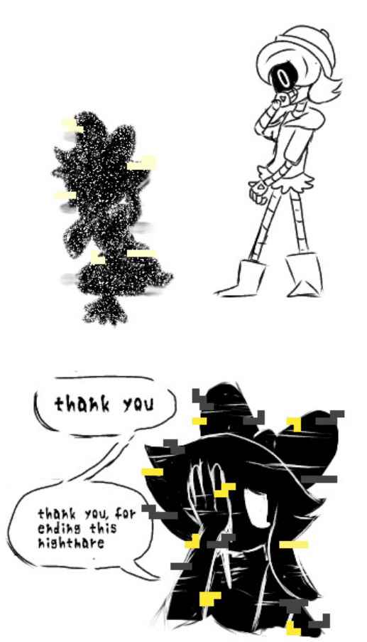 >Alternative ending where N's first instinct to the thing's sinisterness is not "carefully make sure it dies" but rather "yeet the fucking thing into the stratosphere," episode 4 style, then deal with Uzi >By the time the crying and comforting is over, the two realize they have absolutely no idea where the thing landed and eventually have to call off the search for "dealing with it" once they figure out its trajectory was changed by hitting the spire on its way out and could now be anywhere >V, meanwhile, finds the brain-damaged little bastard while out hunting >Pathetic as it is, she figures it's disturbing enough to entice her favorite monsterfucker and gives it to Lizzy as a pet >Lizzy immediately bonds with the living fashion accessory and, after the requisite bed-breaking makeout session of gratitude, dubs it "Doll Jr." >Lizzy thinks it's just one of the indeterminate monster-things that the trio sometimes find on the surface, like Sparky >V thinks it's just one of the mindless dissemblers that went FUBAR with it's matter-collection, nothing to worry about now >Uzi and N, on the other hand, are horrified when they finally see Lizzy's new purse dog, and have to make a decision >Do they tell everybody and try and argue for it's death? >Do they kill the thing in secret and royally enrage their two closest friends? >Do they pretend it's not their problem and just let the thing do whatever it was going to do, let it continue to just... exist, in their vicinity, despite how terrible it's presence makes them feel? >All the while the thing, having lost essentially all memory of its "birth" from the head trauma, starts showing some level of intelligence and trying to explore the world around it, making Lizzy even more attached in the process.
