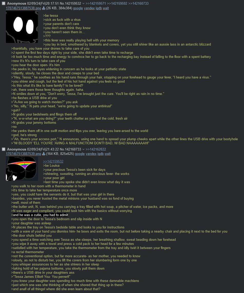 >>322411 Reposting a screenshot some other Anon took of my maid drone greentext. Wanted to write more of it but I got sidetracked by an impromptu two-hour phone call which has officially eaten every last second of my remaining weekend free time. I will keep this story in my mind and try to squeeze in some small updates or at least a little background lore, with a major instalment and the next escalation over the next weekend.
