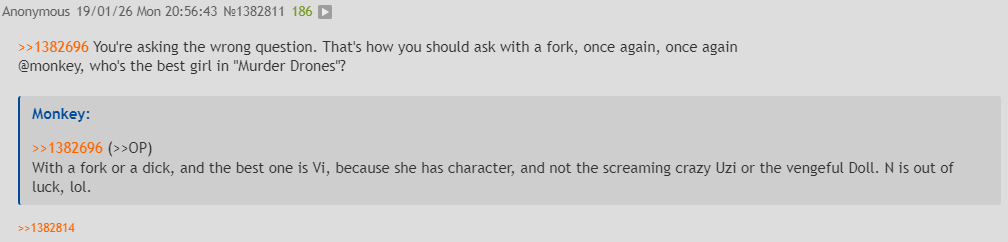 >Be me, anon who likes Murder Drones >Can't regularly interact with live threads, must constantly play catch-up with older posts >Check in the latest thread to see if I missed anything importa-