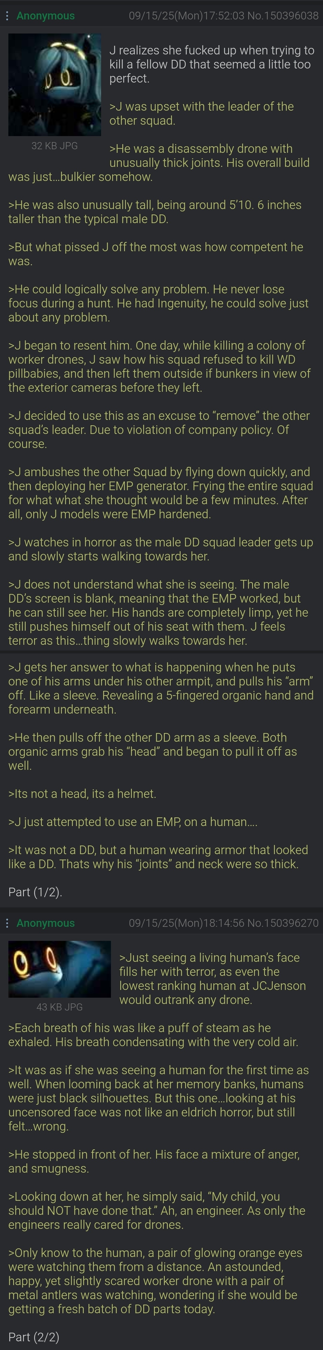 >>322594 I read a few of them while I was tagging stuff. I haven’t read them all so I didn’t notice there was a retcon. I liked the concept of partially formatted recycled drones though.