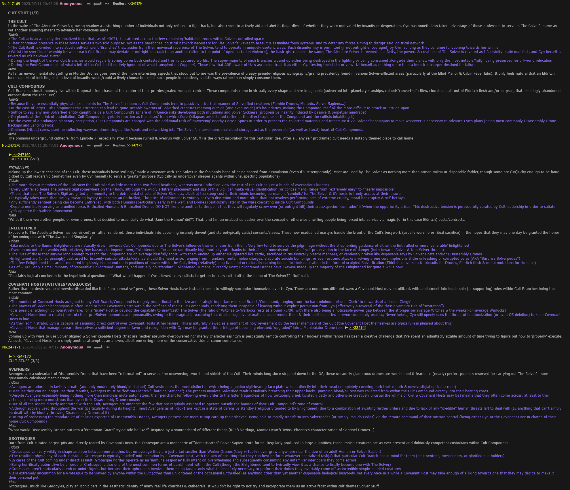 >>322762 Agreed, if nothing else I enjoy entertaining the idea for Solver Cultists because they provide a convenient excuse for indulging in my own worldbuilding 'tism