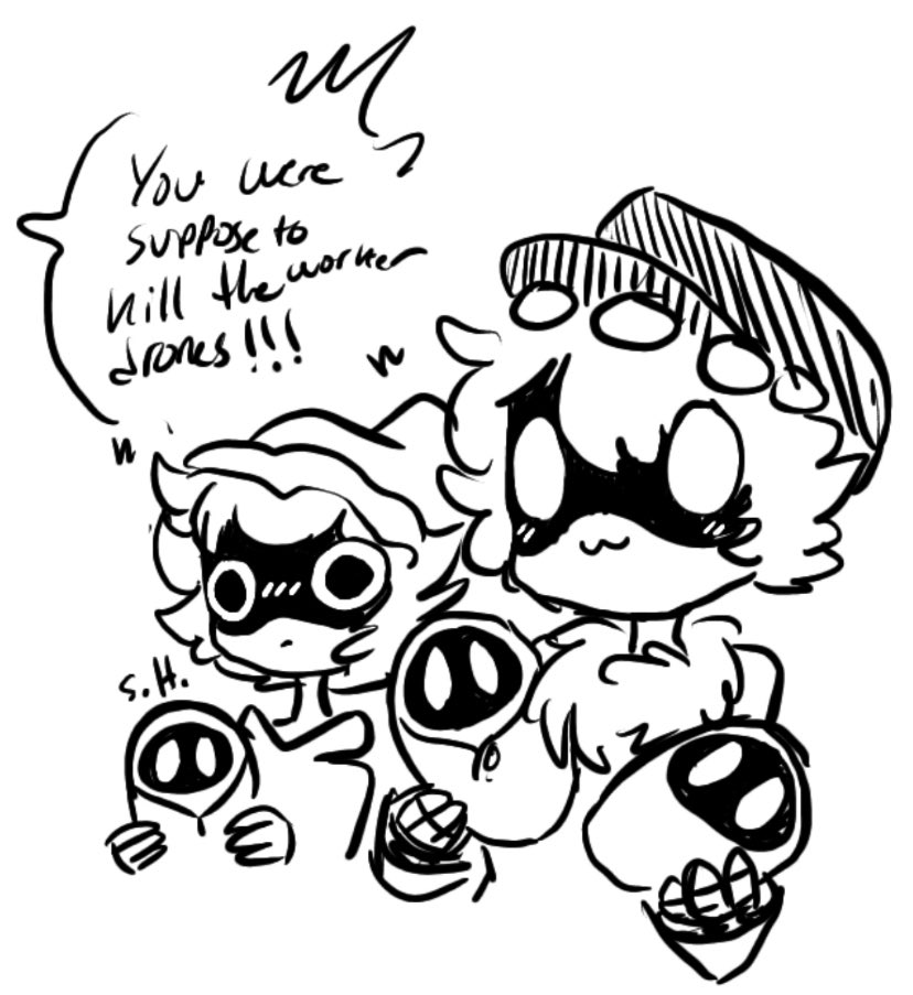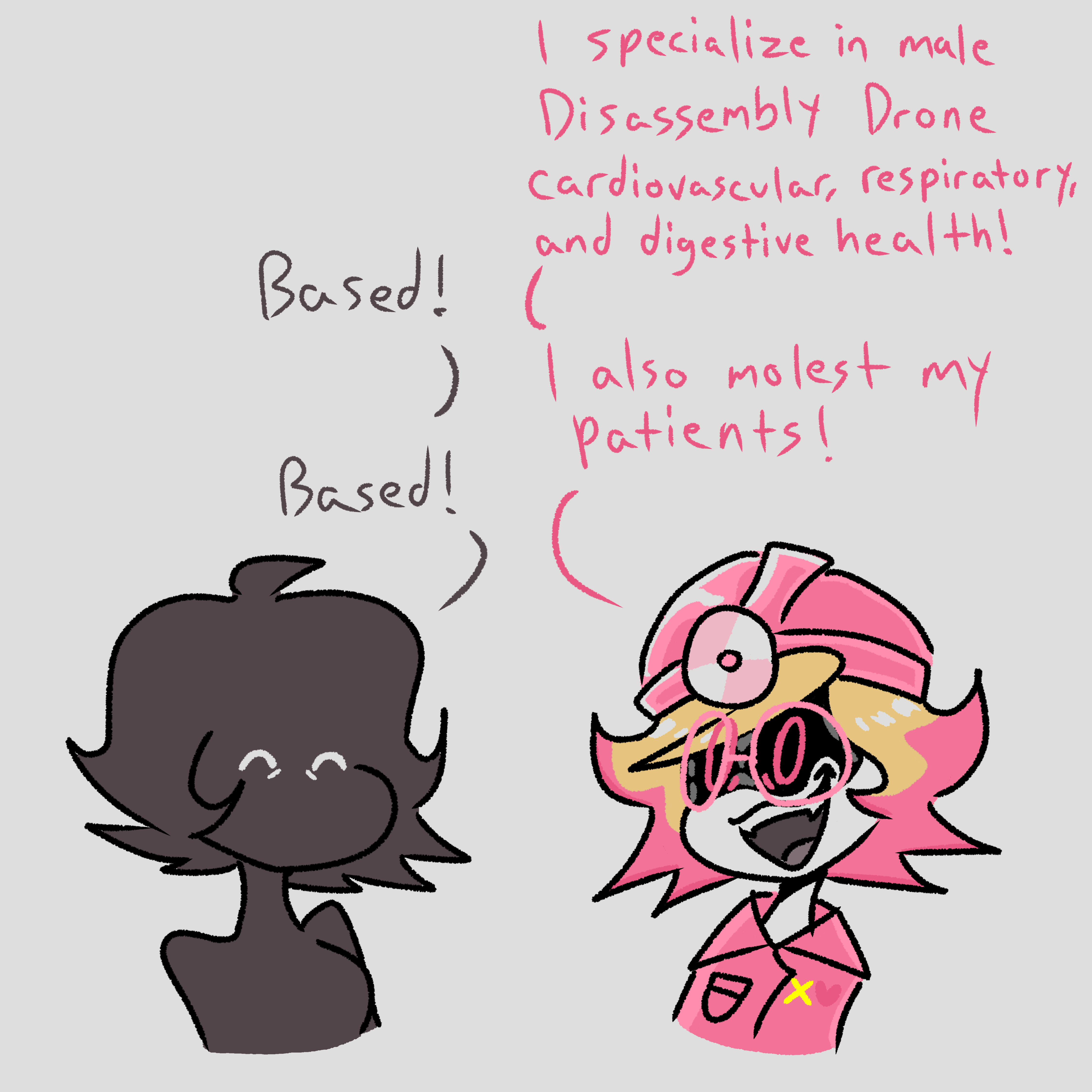 >>323282 This is an old good contentfag. She made a lot of good art and greens, and also often joked about things like feeding N with rocks(it's fun for him). She had her own AU that she developed, essentially about the ordinary life of her, her husband, a defective drone, N, and their two hybrid sons, one of whom is looks like a human and having an identity crisis (questioning whether he's more drone or human) and a racist nerd, who looks disassembly drone.