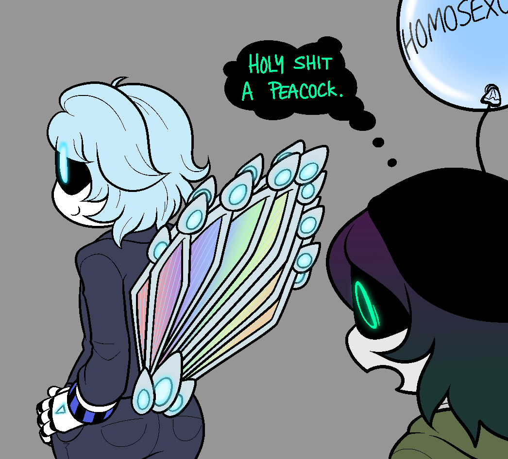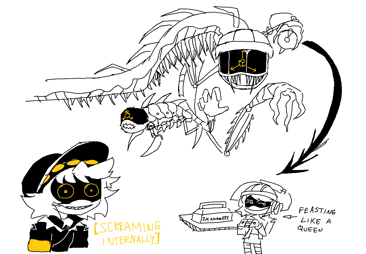 >there was an instance around middle school where N, upset at being the odd man out of his family, had Uzi trigger his own solverpede transformation so they could all match >sure he was big and clumsy and extremely dangerous for ordinary drones to be around for a while, but that would all fade in time >the REAL problem is that it was nigh impossible for anybody to tell the "big worm creature with yellow cameras and white color scheme" from the other big worm creature of identical description >so thus started instances of Geist being blamed when N wrecked something, and N being accosted by Geist's classmates for questionably-legal activities, and occasionally one or the other pretending to be their alternate with holograms for one reason or another >the experiment came to a sudden and conclusive end when Uzi, pent up and wanting some husband time, started stroking what she THOUGHT was N's chitin >"bad touch" made it down the grapevine before anything truly scarring could happen, but the idea was never seriously entertained again