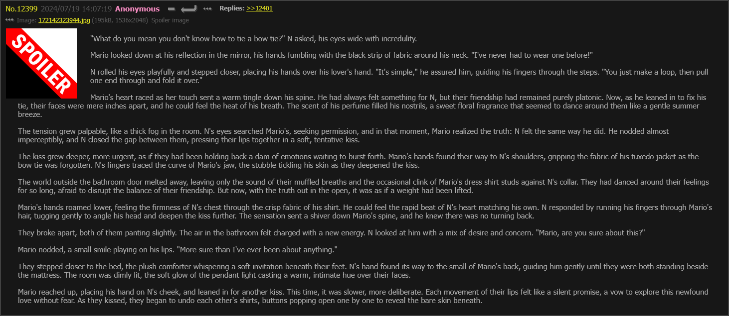 >>324228 I like how there's a singular instance of referring to N as "her", like the anon wanted to pretend it was actually gonna about Fem!N and that he isn't, in fact, gay for writing this.