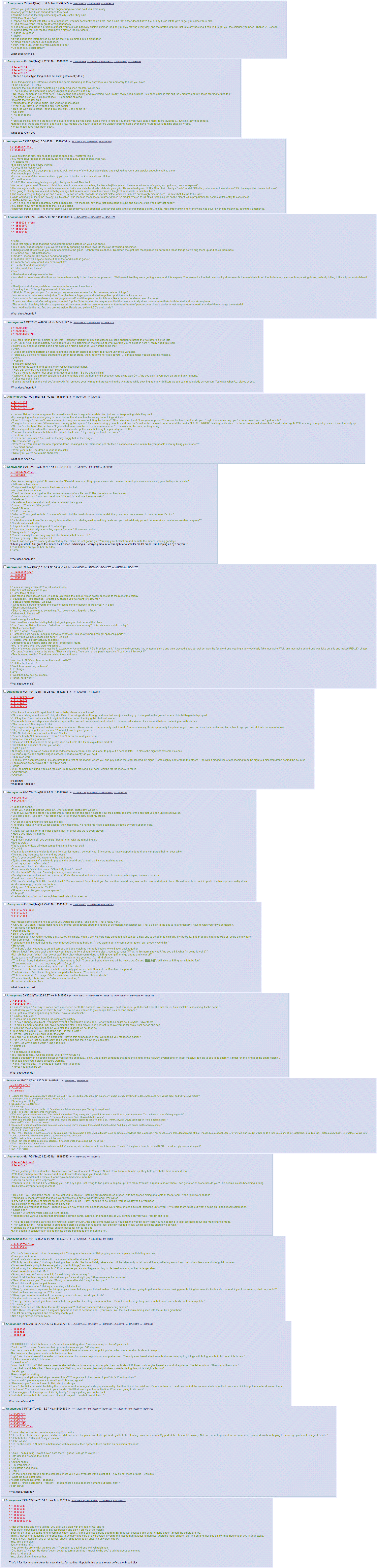 >>324149 >Keeter keeps a "Dissembled" folder cause it's the norm >but every single image is some variation on her father or her honerary aunt, sometimes including cosplayers of their wives and sometimes not >she clearly can't do anything with this, and it kills the mood like nothing else, but she's gotta scroll through to get to her actual stuff >so Keet has developed a habit of clicking the folder and then squeezing all her eyes shut as she furiously scrollwheels down to the bottom, stopping only when it "feels about right" >the second worst part is this folder is something she traded for, and so every image is fresh horror >the worst part is, occassionally, when she gets the timing wrong, she ends up seeing blurry camcorder vids she suspects to be recordings of her real parents' private times >she's too scared of what she might learn to check one way or another