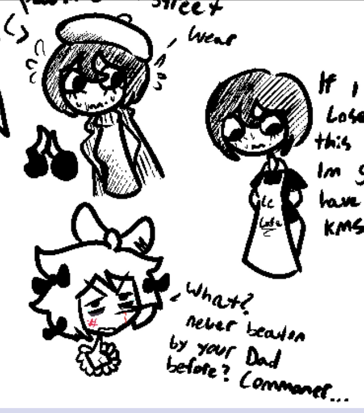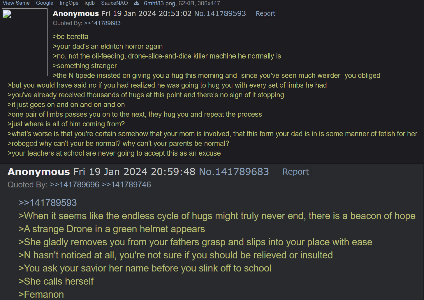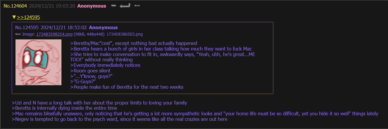 >All the Nuzi children are bonding over parental trauma >Negev locked in a lunatic asylum >Akita deliberately shunned by Uzi >Arrow straight up thrown in the gutter >Geist rejected by his parents who’ve also very well tried to get rid of him >Remmy having his dad killed by his mom >Colt forever failing to meet his parents expectations >”What about you, Mac?” >”I don’t know, man.” >He appears to be deep in thought. >The others look on with a looming sense of dread. >They’ve only heard terrible things about Mac, but to imagine what kind of maltreatment he suffered at the hands of N and Uzi, to inflict upon his mind to become the reputation he’d earned, none wanted to imagine. >Mac is still silent. >Akita tries to comfort his duress. >”Bro, it’s ok if you don’t want to talk, we’ve all gone through some tough stuff and we get it” she says. “Most of us, at least” she says, side eying Beretta. >”No,” Mac says. >”W-well I mean, if we can’t-“ Akita says, before getting cut off. >”He touched me.” Mac says. >Everybody is slack jawed, eyes wide. >Beretta scoffs, but Negev is stunned. >This was something she’d never thought her brother would admit. >This was getting extremely awkward. >This was another level of bad. >”We don’t have to talk about this right now,” Remmy says. Remmy himself is having an on the spot cold breakdown at the implication. >”Dude.” Arrow says. >The room is silent, for the moment. Geist breaks the silence, reading the room. >Nobody wants to hear what’s about to come next. >”I was working that day.” Mac began. “He came by to see me. I always thought we had a good relationship. Everything seemed fine.” >”Maybe he thought I couldn’t handle the stress. I don’t know why decided to work along with me. He was in our uniforms. I don’t know if his job in the Outpost even allows him to do that.” >”The whole Outpost loves him. I couldn’t make him leave. That was where everything just started to go wrong.” >”I was helping a customer, I thought I was doing fine. But apparently Dad was troubled. He always kept watching me. Following me around. Trying to find me alone. I was just trying to work.” >”He came up behind me while I was working one on one with a customer. He had me where he wanted me.” >”Then he-“ >Mac froze. He adjusted his words, catching his next lines. >”Right in front on the customer, he…grabbed me to face him. He used his strength to pin me there, I couldn’t escape.” >”I couldn’t understand what was going on, I was too busy trying to deal with the customer. But he pinned me against the table with his arms.” >”He had that smile, that hypnotized everybody around me. I couldn’t do anything.” >”His body against mine, his chest against mine, forcing me against the table. He put his hand on my head, rubbing it. Then he told me, with that damn smile, “Nice job, kid! You’re doing well with the ladies. Keep them happy, haha!” >”Then he let me go. Everybody had seen it. Dominating me against my will, penetrating the tender working of my inner image. It was-“ >”-Hold up,” Negev said. >”Yeah sis?” >”Are…are you talking about what happened last weekend when he hugged you in front of everybody while you two were working tables at Disassembly Drone Hooters?” >”What the fuck?” Colt said. >”DUDE! THAT WAS EMBARRASSING AS FUCK!” Mac yelled. >”The customers wouldn’t leave me alone after that! You know how many old ladies tried to give me their numbers after that?” >”Mac, what the heck are you talking about?” Akita said, baffled. >”One of my teachers literally showed up while I was on shift, she wanted me to find Dad so that she could pay us to wipe each other’s shorts in front of her while I moaned and called him Daddy. That was so freaking awkward!” >”I thought we were TRAUMA BONDING!” Remmy said. “WHAT IS THIS?!” >”Man, after he hugged me, I literally couldn’t get a break for days at my job! Have you ever been sexually harassed by ladies twice your age for days on end, on and OFF work? I was mentally drained after sleeping with ten of them! It fucking sucks, I have to lie to my girlfriend saying I’m volunteering at the Senior home!” >”G-girlfriend?” Colt says. >”Yeah, and now she’s told me that she wants to see me and Dad fuck, because it would be hot for her!” >”What does this have to do with N and Uzi?” Arrow said.” >”Like, seriously. I feel like you’re bragging about getting laid.” Geist said. >”Man, fuck you guys. I love him, but I wish he wasn’t waiting tables with me. Those skimpy ass outfits don’t do us favors. That gives everybody ideas that I don’t want to indulge in. It’s weird shit. I’m not into that incest stuff anymore.” Mac said, aggravated. >”But you’re okay with P and DS-M working there!” Beretta said. >”Huh? What about them?” >”This was a waste of time.” Geist said. >”Fuck you guys, that was weird.” Mac says again. >The room is silent for a minute, before Akita attempts to restart the conversation. >”Uh, ok guys. What about you, Beretta? What did your parents do?” >”Shit, dude. Well, N and Uzi. I don’t consider them my parents at all. They’re a bunch of bastards, and liars.” >”Harsh. Why do you hate them so much? What did they do to you?” Akita asks. >”They said they were going to take me to the re-release of Revenge of the Sith, but then they forgot. It was…the worst thing they’ve ever done to me.” >”…” >”You’re serious? You gotta be fucking with us.” Negev says. >”It’s a better written reason than your shitty asylum arc.” said Beretta. >”Shut up, sis.” >”Maybe you should try being normal, like me, idiot, and then you won’t get thrown in the loony bin.” Beretta responded. >”Fuck off.”