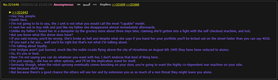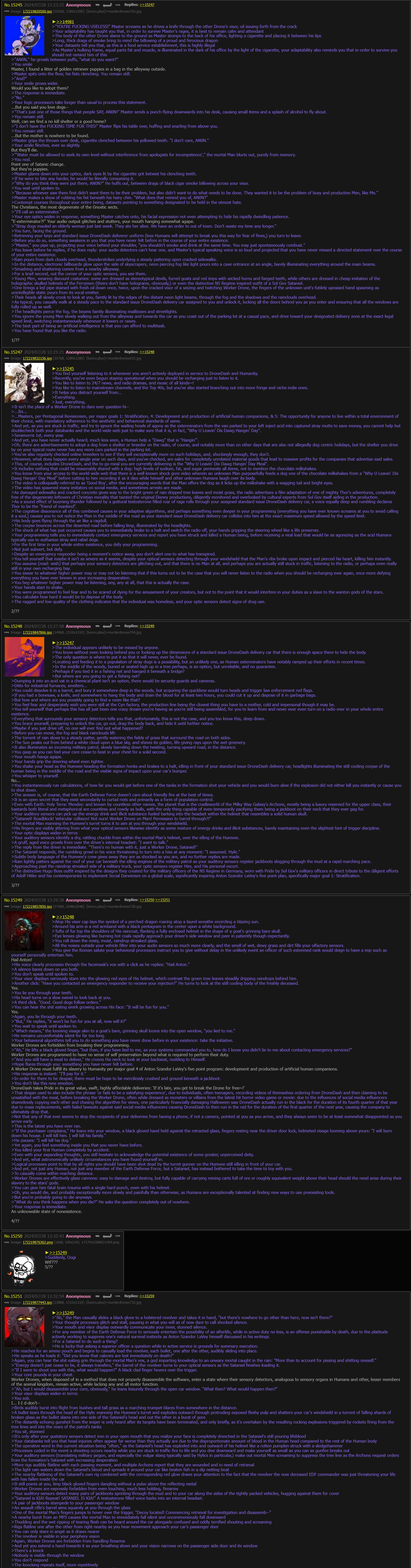 >You’re on a path in the woods, and at the end of that path, is a cabin. >And in the basement of that cabin is a drone. >You’re here to slay her, if you don’t, it will be the end of the world.