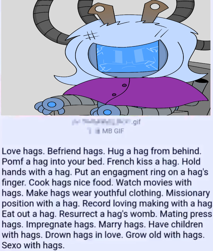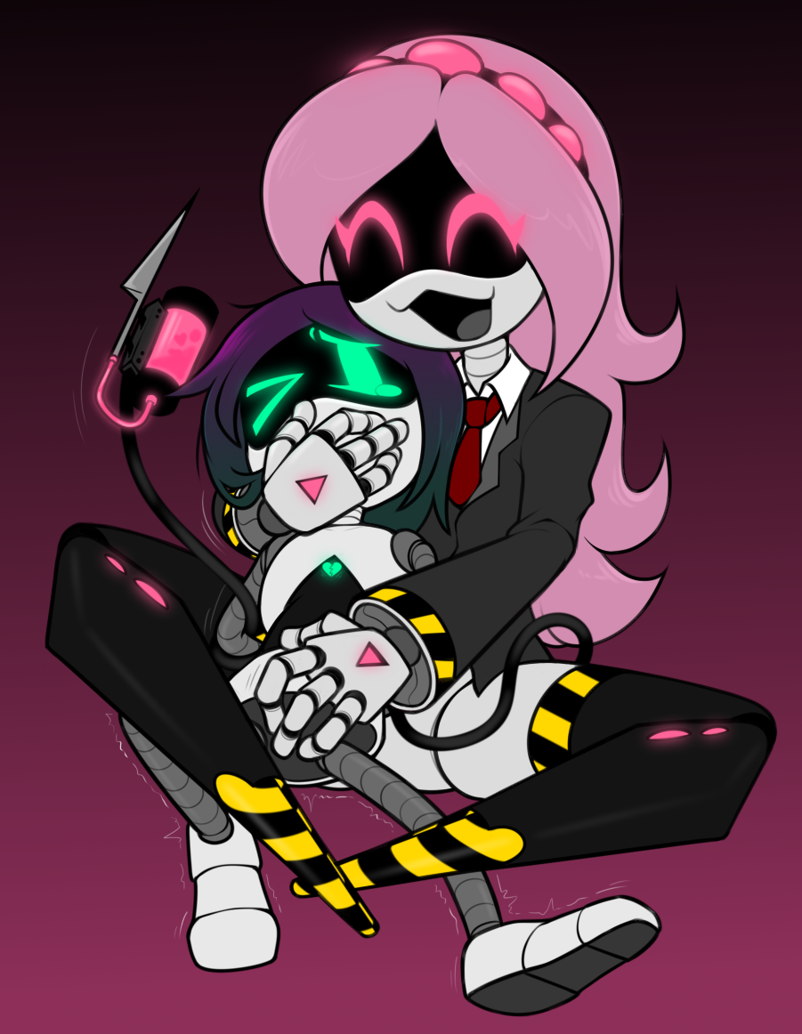 >Each time you grab a clump of dust and pry it off her components her grip and tail tightens >You’re nearly done but it’s getting hard to move your fingers and you feel like there are ants crawling on your arm >You look at your arm >It’s pale white and you can see blue veins on it >Y is squeezing your biceps hard enough to stop blood flow >You can feel your arm going limp >You quickly try to pry it away but it’s no use, Y’s tail is too strong >In desperation you begin rubbing Y’s tail with your other hand >Y’s stinger begins pointing up and her tail tightens further >Not relenting, you rub faster and closer to the base of her tail >Y pulls you closer to her >The pain your your constricted arm is becoming unbearable >You continue to rub, grasping her tail fully with your free hand >You gently pinch the base of her tail and move your hand up >This gives you wonderful results >Y’s tail becomes soft and limp >You use this moment to free your other arm >Blood flow resumes, you begin to move your fingers >You fall flat on your ass and start holding your arm >You catch your breath and recover for a while >After you calm down a bit you look at Y >She’s completely immersed in bliss >She’s looking at the ceiling, gasping and groaning, drooling onto the bed, her limbs limp, only her tail moving, searching for you to pull you in to finish the deed >You grab the can of compressed air >You move closer to her and place on hand on the top of her bottom plate as you lean in to see her hatch >You put the can up to Y’s hatch >Before you can press the cap Y puts her hand on the top of your hand >You look up at her >She tires to smile through her pleasured haze >The result is more akin to showing off her saliva covered fangs >Her eyes are now focused on you >The only thing letting you know she’s not having predatory thoughts about you are the heart emoticons on the sides of her screen >You flip your hand over and begin holding hands with Y >Y shifts her head to see you better >You smile at her and begin to blast her with compressed air >Y begins to moan >Her fingers intertwine with yours, her grip on your hand is strong enough to make your wrist hurt >You hold the cap held down until a loading screen icon appears on Y’s screen >Y’s joints lock as she enters her boot loop >You continue to kneel on the floor holding Y’s hand waiting for her to wake up >The loading screen disappears from Y’s screen and is replaced by her eyes >She slowly looks around the room >Her eyes focus on you and she gives you wide smile “Zat… vas great~” >Y showers you with praise for a while >You stand up and lean over Y >She tries to raise her head up but the afterglow is making it hard for her to move >You lower your head until your mouths meet >You begin to kiss >You expect Y to shove her tongue int your mouth but that doesn’t happen >Y is being passive and letting you take initiative >You use this opportunity and grab her by the sides of her head as you intensify the make out session >Y whimpers as your tongues meet, you poking her big soft tentacly grey tongue with your tongue >The beast that usually wraps it’s self around your tongue is laying defeated and limp, unable to respond to your teasing >Y continues to squirm in pleasure under you Suddenly Y places her hands on the back of your head >Wait… >Y giggles >You suddenly realise you walked into a trap >Y locks her legs on your hips >You open your eyes >You look Y in the screen >It displays a [ >:) ] >Y pulls you closer to herself >Her tongue begins to move and forcefully slithers it’s way into your mouth >She ravel her tongue around yours and begins to squeeze >You continue to exchange spit, Y feeling around your mouth, exploring every millimeter of it’s inside with the tip of her tongue >After a while her tongue starts making it’s way to your throat >You begin to panic, but before Y starts forcing her way to your stomach she breaks the kiss >You exhale sharply and fall onto the bed, beside Y “I love you~” >You catch your breath and clear your throat >”I…. love... you too…” >Y starts cuddling up to you >You try to stand up >“Wait… I still have to fix your networking components so you can download that driver” “Vhat driver?” >Y looks at you questioningly as she closes her maintenance hatch >Y quickly realises she just blew her cover >She looks at you nervously >”I mean….. uhh…. Ze update can vait…” >You kiss her on the screen >You continue to lay on the bed and cuddle for a while