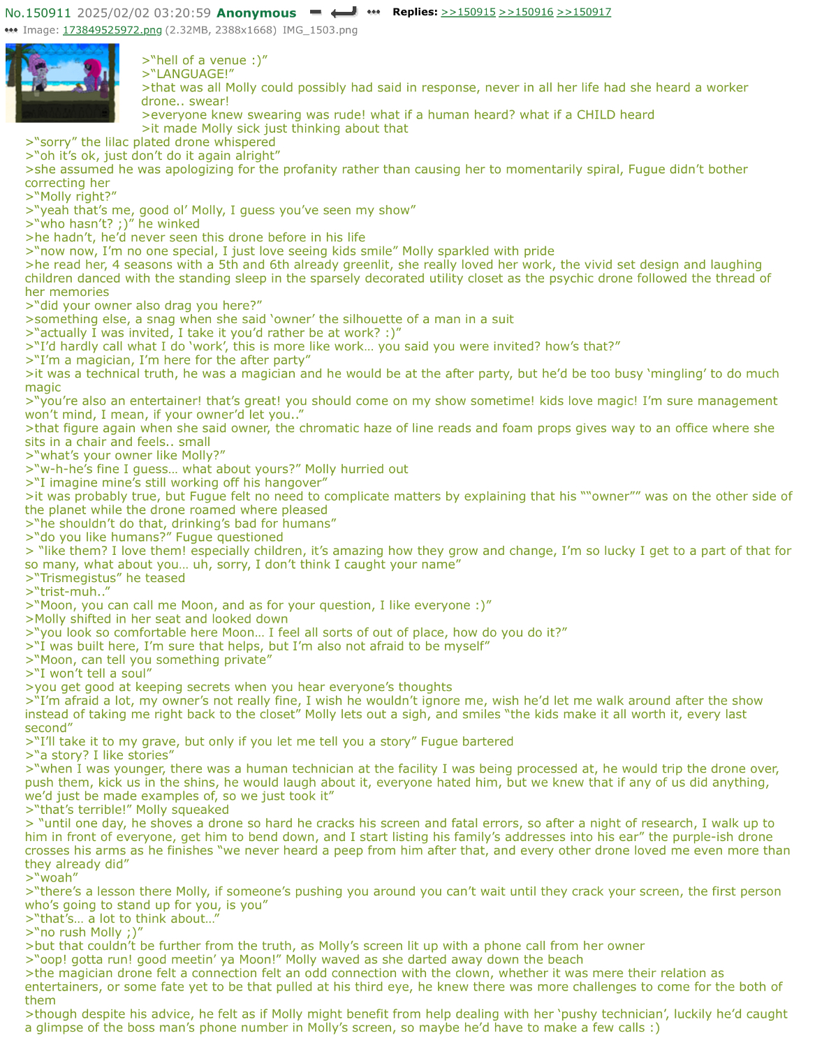 >>324299 >>324303 >>324306 >>324395 Glad you liked it friends! How is everyone's morning/night going btw? I had a great night, played some DnD with my friends, I admit I wasn't in a mood for roleplaying today due to some bullshit that happened but I quickly got into the groove of things Mostly because I played an artificer with a steel defender named Yvonne, her notable feets include : taking only one point of damage despite being one of the two frontlanes in the party, dealing 0 damage over the course of the game, reloading my charachter's musket a few times, and me using her hat as extra storage by stuffing a bag of holding into it, so all in all she did great and I could never ask for a better teammate and I cold describe my charachter cuddling with her in the bedroll during long rests Also thank you to the person who uploaded the green to the booru gorilla_grip_tailussy !?
