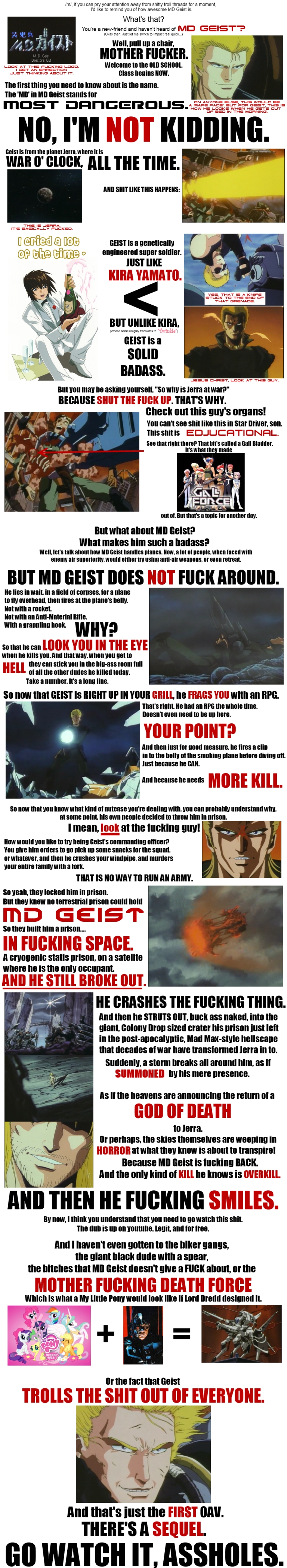 >>324427 >mfw Uzi named him Geist as a dual meaning/futureproofing thing: if he becomes a monster, then it fits because the Geist from MD Geist was a single-mindedly destructive killing machine, and if he tuns out normal, then it fits because MD Geist is some of the sickest fucking shit Uzi has ever seen and one of her favorite OVAs of all time