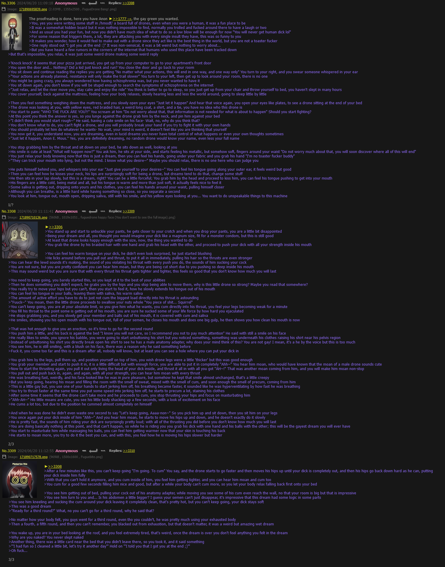 >>324279 >>324196 >DD Pidge squeezes your neck, relishing the rasp from your throat >You try to break free from her grip, but her tail holds your arms tightly >Disassembly Drone pulls you closer, her warm breath fanning your face as drool falls in thin threads >Razor-sharp teeth gleamed dangerously before your eyes, but your scream was stifled by the disassembler's tenacious grip >Inside, you know it's over, but you continue to flounder in the despair of the dead, in a futile attempt to save your life >But her mouth suddenly closed on yours, becoming a kiss >Your eyes widened in surprise, feeling the demon begin to penetrate your mouth with its tongue >There was no struggle. The more massive robot tongue simply entered, ignoring the feeble attempts to stop invader and establishing its dominance >She explored your insides greedily, brazenly, disregarding you and tasting everything within her reach >Her saliva was bitter and thick, coating the inner walls of the mouth, penetrating the throat and the esophagus >She watched with a smirk as you writhed in humiliation, trying to maintain your composure and prevent her from enjoying your helplessness >But she grew tired of mere toying with you, and she went deeper >Your eyes rolled back in pain as the walls of your throat parted, unable to withstand the onslaught >And a blow to your belly knocked the last of your spirit out >A precise pressure on a specific spot, with the perfect speed and depth that only an artificial intelligence can achieve >The effect was immediate, and soon your stomach muscles groaned, a multitude of spasms swept along your esophagus, triggering a biological mechanism >The drone merely smiled >Finding the perfect moment, she pulled her tongue back in, but didn't break the kiss, and the contents of your stomach immediately rushed out >You heard moans of pleasure as your half-digested army ration passed from your mouth to hers, she sucking it all in thoroughly, not letting a drop go to waste >Finally, after a full minute of pure agony over you, when she had taken out everything she could get, and when your body went limp, unable to fight any longer, only then did she release you >You fell, in pain, not only physically, but also with wounds on your soul that could never heal >Murder drone only chuckled, she released her wings to cut through the air like an arrow, soaring upward >You remained lying there and tears streaming down your cheeks