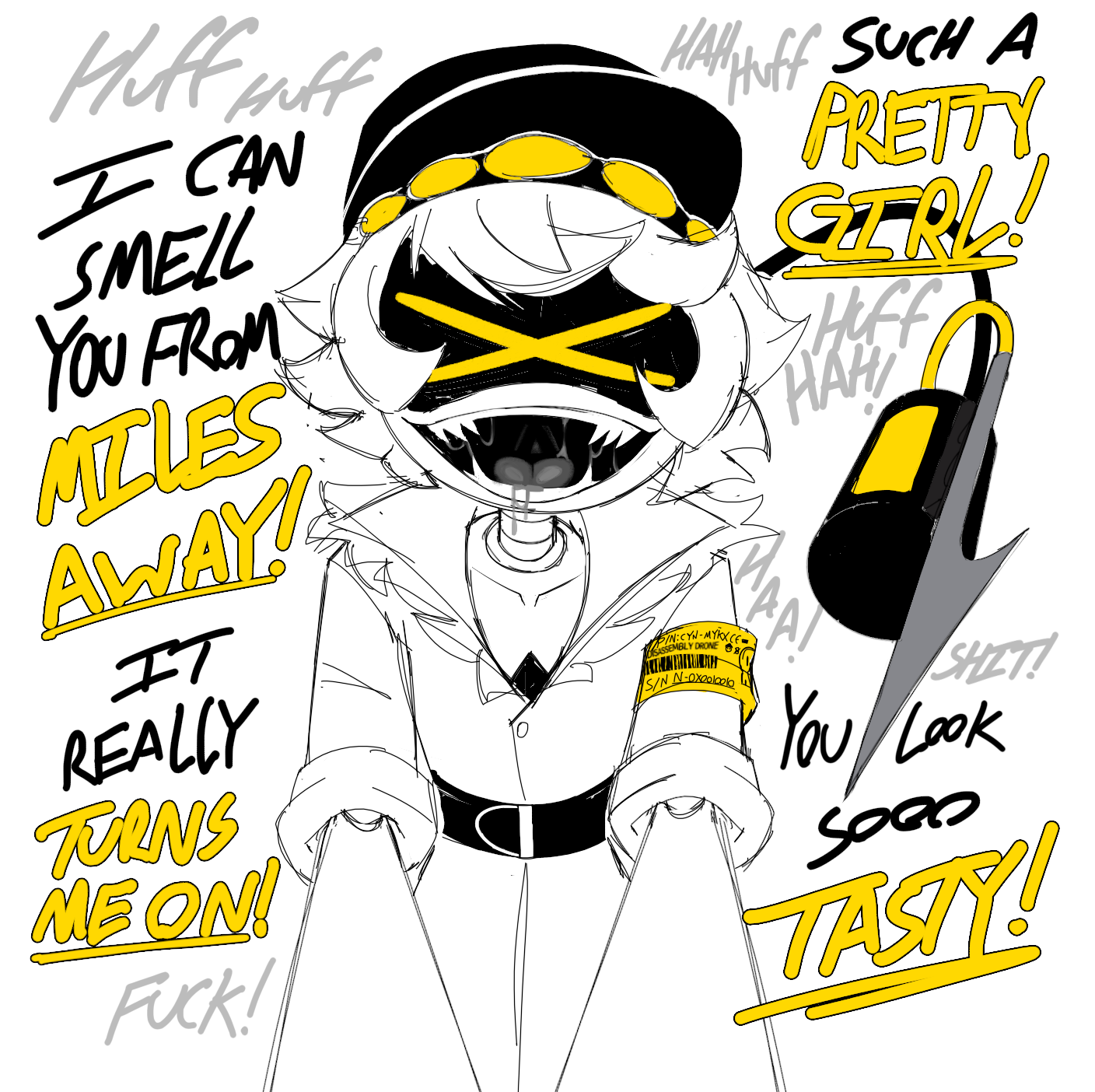 >Fun Morning OC Facts: Another part of being a Solverpede Geist dislikes: his body shape (serpentine body, riblike legs coming out of the edges of his belly) means that he can't wear non-neckwear clothes like everydroney else can. >Among the extremely few articles of clothing he does have are scarfs his spinster Auntie V has crocheted for him sometimes for Christmas (another Fun Morning OC Fact: his birthday falls on Christmas, which did not help his parents' initial concern when he was born that he might be the Robo-Antichrist). His favorite is a red one she made when he was still finitely long. >If the writer of this Fun Fact had come up with this idea when he was writing that initial green about him, he would have included Geist throwing it off when he realized that he was officially having an immoral makeout session with his childhood friend the daughter of his homeroom teacher, right there on the floor of a long-disused high school bathroom.