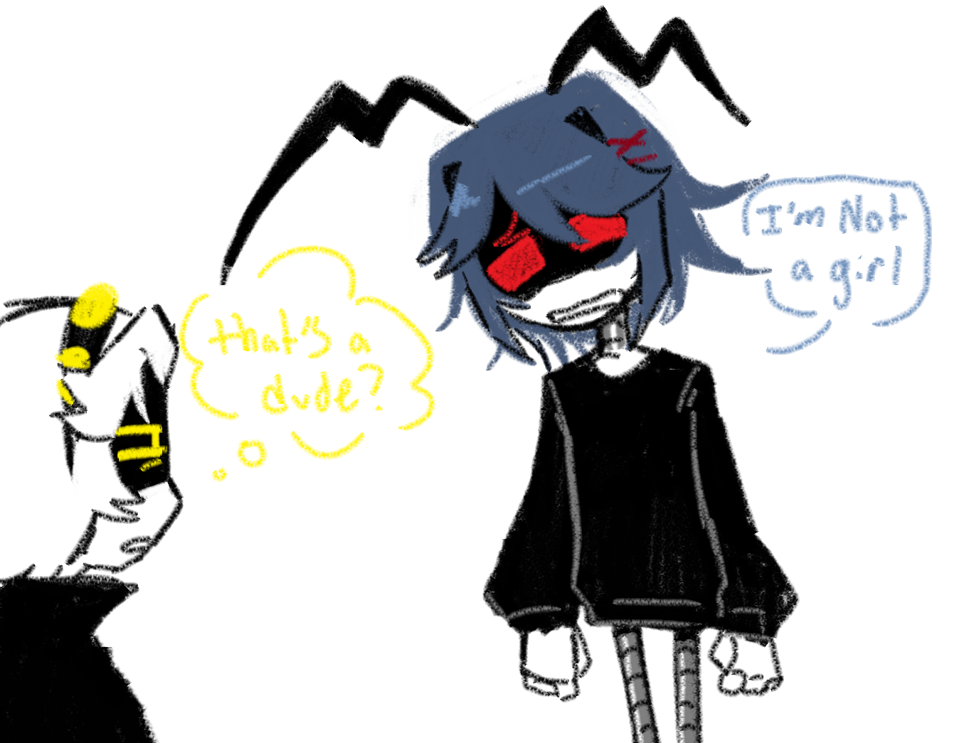 Gotta be honest, when I came up with Geist using his dronesonas for callbacks to the episode 2 improv stuff, I wasn't thinking of him as a wannabe actor. I was just thinking of it as him talking to himself to feel less lonely. Like how he also uses his dronesonas to give himself hugs.