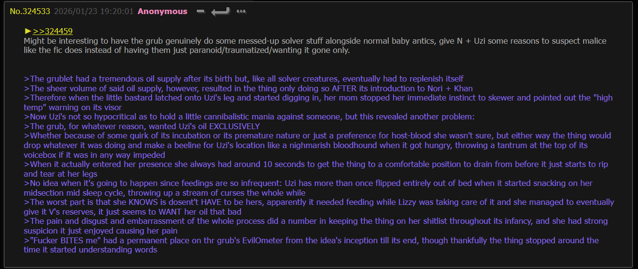 >Even Doll's jaw is dropped in the back of Uzi's throat, and she had no hope at all for any of this >Keeter wants to vacate the area >Still, sibling loyalty compels her stay >Even if she's cringing worse then the time mom called her a "fragment of beautiful infinity" through the school PA system >Uzi is spamming N on his DD Hud >He was offworld at the time, so his ETA is gonna be a full 30 minutes >Colt just gives an "I KNEW IT!" >Pivots out of the room like dad during Solver War Story Hour >He always suspected his birth was some kind of skill issue >Still figured it was someone other than his "parents'" but you can't win em all >Tries to vow to the blankly staring (because between comms with N and panicking she forgot to address the situation) Uzi that he'll prove himself and earn her respect >She can practically feel the "Bite me!" that comes out of his mouth instead >By the time N gets home she's in full on panic mode, needs to be comforted before the situation can be address and/or Cyn can posses her >Cyn's too busy laughing her lack-of ass off to do anything right now, but they don't need to know that >By the time it's all over, a single mental lapse remains >From within her deeper depths, an ancient spirit takes advantage >"Coulda' gone worse mate" >"Shut up Tessa"