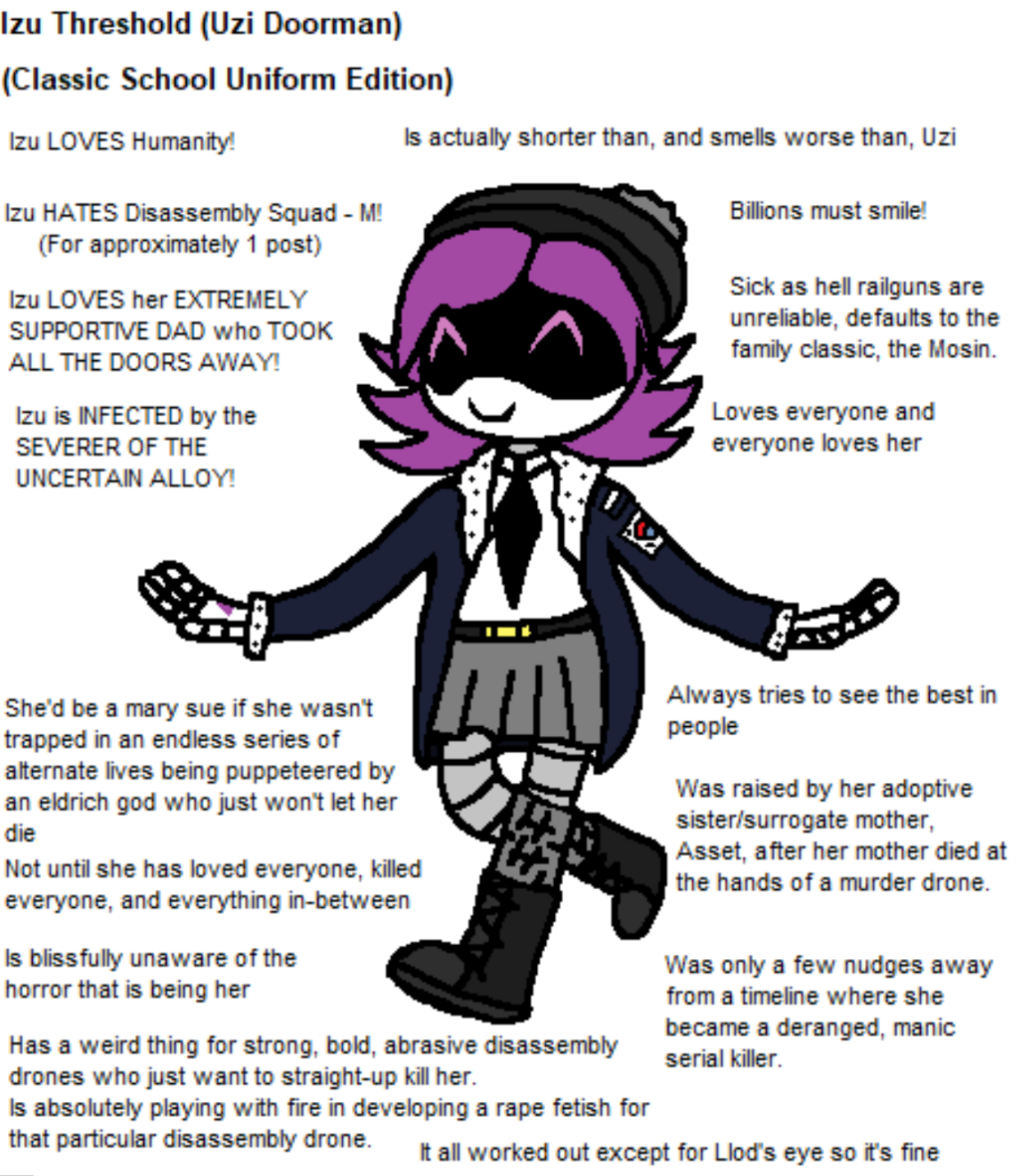 >Be Uzi >Class day >For some unholy reason, the teacher says by school curriculum they’ll have an hour of sex ed >It happens >Whole class is filled with shitty dick jokes from the male classmates >Meanwhile the girls discuss the lesson seriously >Teacher talks about firewalls, deactivating fertility options, all the gist related to drone coding >Uzi thinks >The Solver tism gave her a terrible mix of flesh and metal in one gremlin body >And a stud of a himbo vampire drone boyfriend >At this point she’s lost count how many times this murderbot has taken her to cloud nine during their “alone time moments” >While she’s drowning in horny thoughts, the teacher mentions old illnesses that used to happen to humans with viruses and other nasty stuff >Hours pass >Uzi forgets the whole lesson and later indulges with her drone bf >pipe sound.mp3 >Days later >She wakes up with a terrible itch down there >Dear robot lord in Christ, what the fuck >Goes straight to the drone hospital >Doctor is confused >He’s never seen this happen with drones before >But I guess Solver users get some extra "life inside them" >He advises absolutely no contact for days until full recovery >The next days are filled with uncomfortable agony for Uzi >N gets a chastity cage until he recovers >Her lesson here is: >Practice safe sex with your partner
