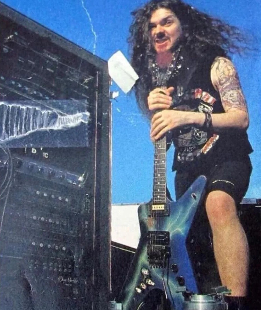>>329086 Woa first green lore about this drone!?! (°o°)But yeah I want to add he does actually have a body and not a floating disembodied head like garrett bobby ferguson from regular show kek. I based this art off of a real photo of Dimebag (picrel) putting the headstock of his guitar up to his beard while showing off his guitar rack and rigging setup. Also cool 90s audio technology!
