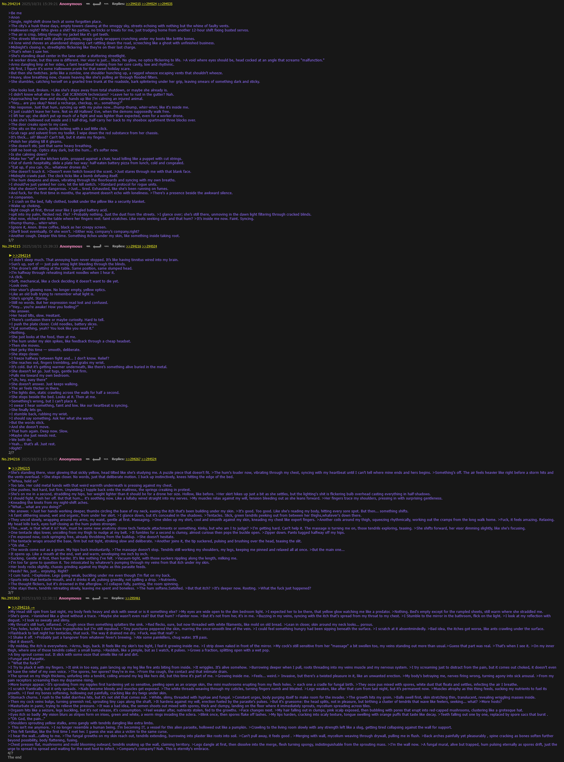 >>328824 YOU ARE ANTON ANTONOVICH, ABOUT TO BE A STUDENT AT A PRESTIGIOUS UNIVERSITY. @ FOR THE SAKE OF YOUR STUDIES, YOUR PARENTS ARE SCHEDULING YOU WITH YOUR EIGHTH-REVICE AUNTE ON YOUR GRANDFATHER-IN-LAW, YACHSMITOVNA, IN BLOCK 110-D3-4L-UP-K4, CLOSER TO THE UNI. @ ON THE EVE OF YOUR FIRST DAY, AUNT YACHSMITOVNA STRONGLY RECOMMENDS YOU TAKE A BRIQUETTE OF BELYAK WITH YOU. @ YOU LOOK AT HER CONFUSED AND ASK, "WHY?" @ - "Why? For the fare," - SHE ANSWERS. @ YOU HAVE NO LESS QUESTIONS, BUT YOU STILL TAKE THE BRIQUETTE OF WHITE CONCENTRATE. @ @ @ NEXT SHIFT YOU BARELY MAKE IT IN TIME WHEN THE ELEVATOR TO ARRIVE AND JUMP INTO IT. @ YOU ARE IMMEDIATELY PARALYZED WITH HORROR: A GOOD PART OF THE ELEVATOR CABIN IS OCCUPATED BY THE HUGE CARCASS OF AN DRONE ARACHNE. @ YOU SCREAM AND TRY TO BACK UP, BUT THE DOOR HAS ALREADY CLOSED BEHIND YOU. @ YET, YOU CAN'T SEE THE OTHER PASSENGERS ARE TERRIFIED: EVERYONE IS LAUGHING AT YOU AND FEEDING ARACHNA HALF A BRIQUET OF WHITE CONCENTRATE. @ ARACHNA PURRING CONTENTLY. @ NATURALLY, YOU ASK THE GRANDPA STANDING NEARBY WHAT THE HELL IS GOING ON HERE. @ "Oh, that's Marusya, don't be afraid of her, she's tame!" - THE GRANDPA LAUGHS. - "She's already taken us on fifteen cycles! They refuse to build us a proper elevator, so we're stuck riding like this... hand over the fare, hand over!" @ ASKING WHAT WILL HAPPEN IF YOU DON'T "PASS THE FARE." @ "Everyone who didn't pass the fare is taken over as the fare," - THE OLD MAN SHRUGS. @ MARUSYA SEEMS TO SMIL AND WINK AT YOU. @ WELL, ALL IN ALL, BETTER THAN BEING A LIQUIDATOR.
