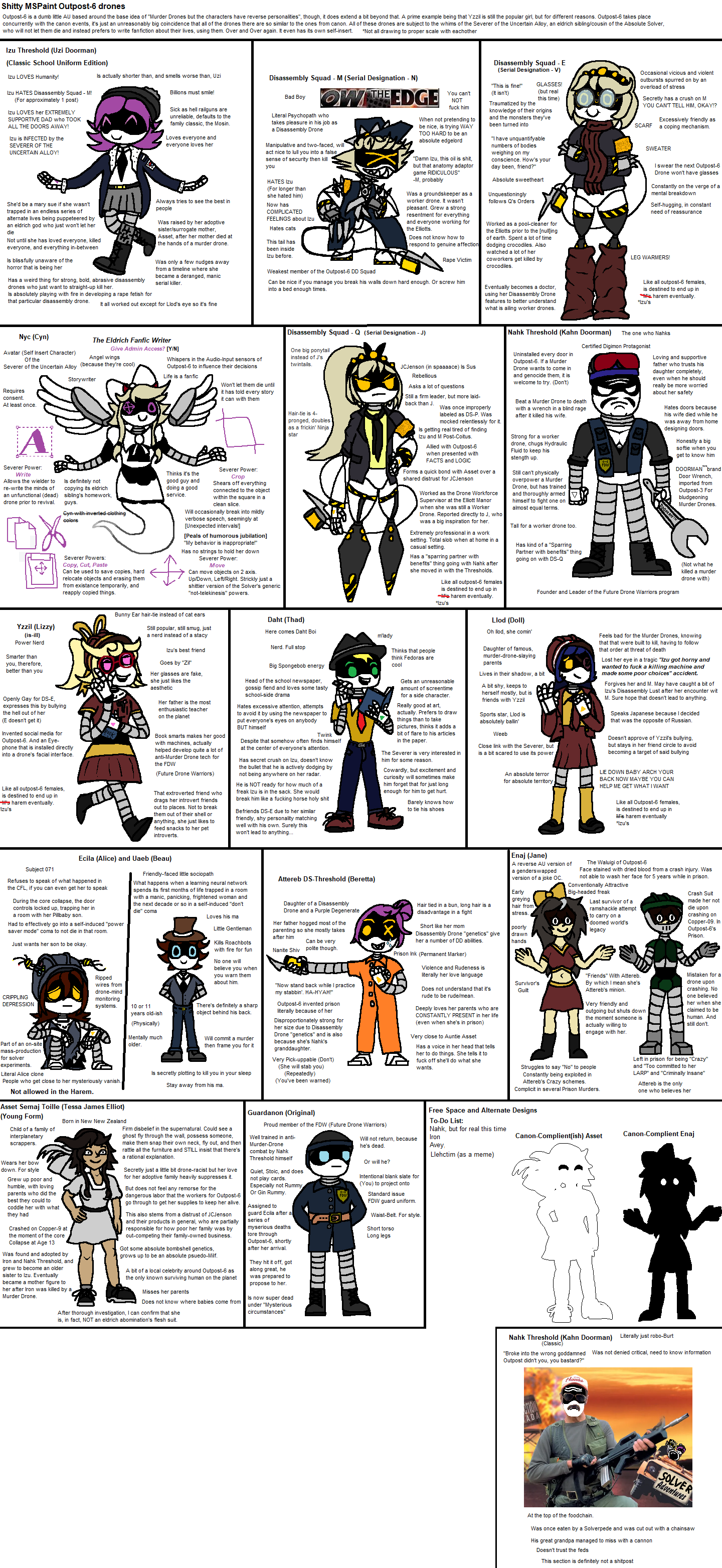 >the effects of Solver triumph in the code differed >while the program's highly adaptive nature made stillbirths rare the conflict typically still annihalated the majority or entirety of the DD bodyplan: less than 5% of even solver-code victories had significant DD resemblance >so instead the solver's own nature took root >human hands for lost manipulators, crab claws for damaged leg code, and eyes for nonfunctional cameras all took shape as the solver-code attempted patch job repairs as best it "knew" how >essentially, this resulted in every instance of solver-victory manifesting a set of (typically severe) zombiedrone mutations upon birth, ones which they had to maintain through their entire lives lest they lose some crucial functionality needed for living in an exorcism >some Sentinels would have perferred a miscarriage >still... despite the horror the instinct was typically love from the zombie's unfortunate parents >indeed this particular half of the "lost generation" is almost singlehandedly responsible the development of mutant rights legislation: parents throwing themselves into activism or agitation at the highest levels of government to save their children from the standing Kill on Sight orders >of course this has done relatively little to save the results from anti-mutant discrimination, but heavy enforcement on the lart of their parents limits the effects to the psychological