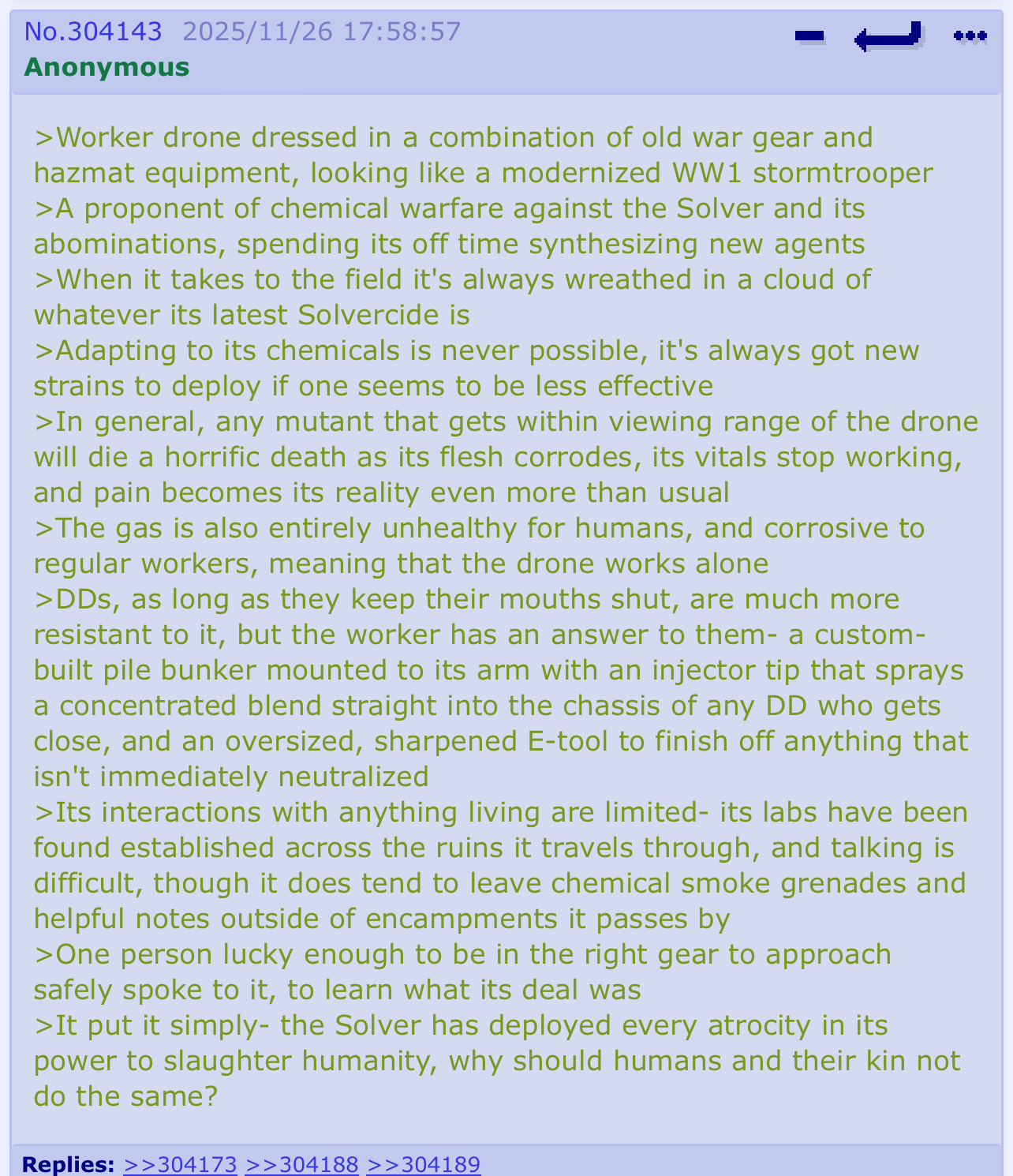 By the way, speaking of Pavo's strength, I remember that when he was being created, the anons, in order to make him strong, gave him one advantage over other sentinel drones: he's a psycho. Anons took the concept that sentinel drones are incredibly emotional and need support to remain controlled and effective, because solver creates such horrors that they actually make you sick. But Pavo doesn't care. He tortures DDs because he genuinely enjoys it, other SDs would be horrified by it, but not him. On the Wiki, on Pavo's page, you can find a link to the thread where Pavo was first mentioned; I think you can read about it there.