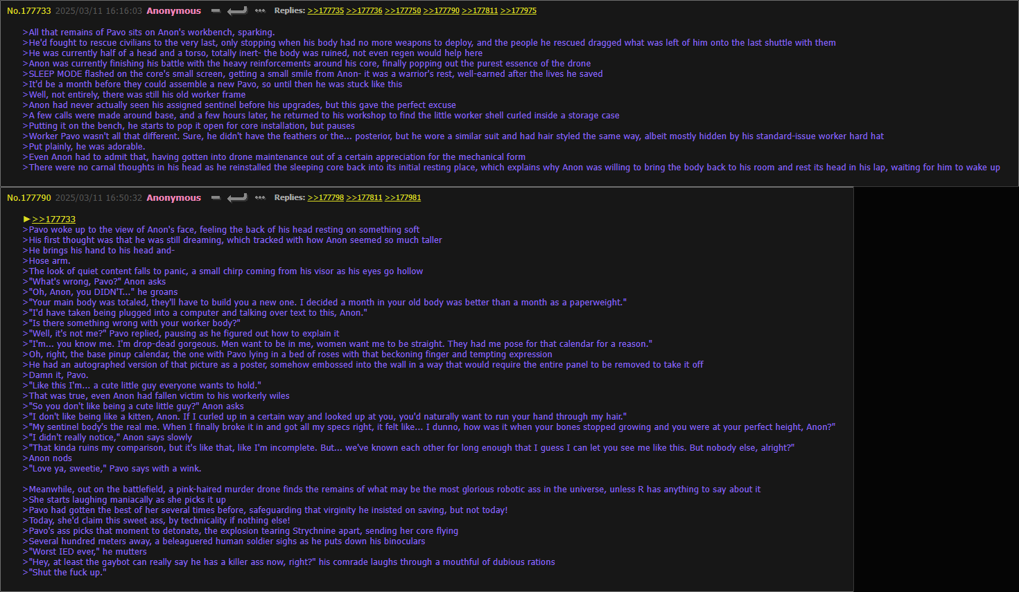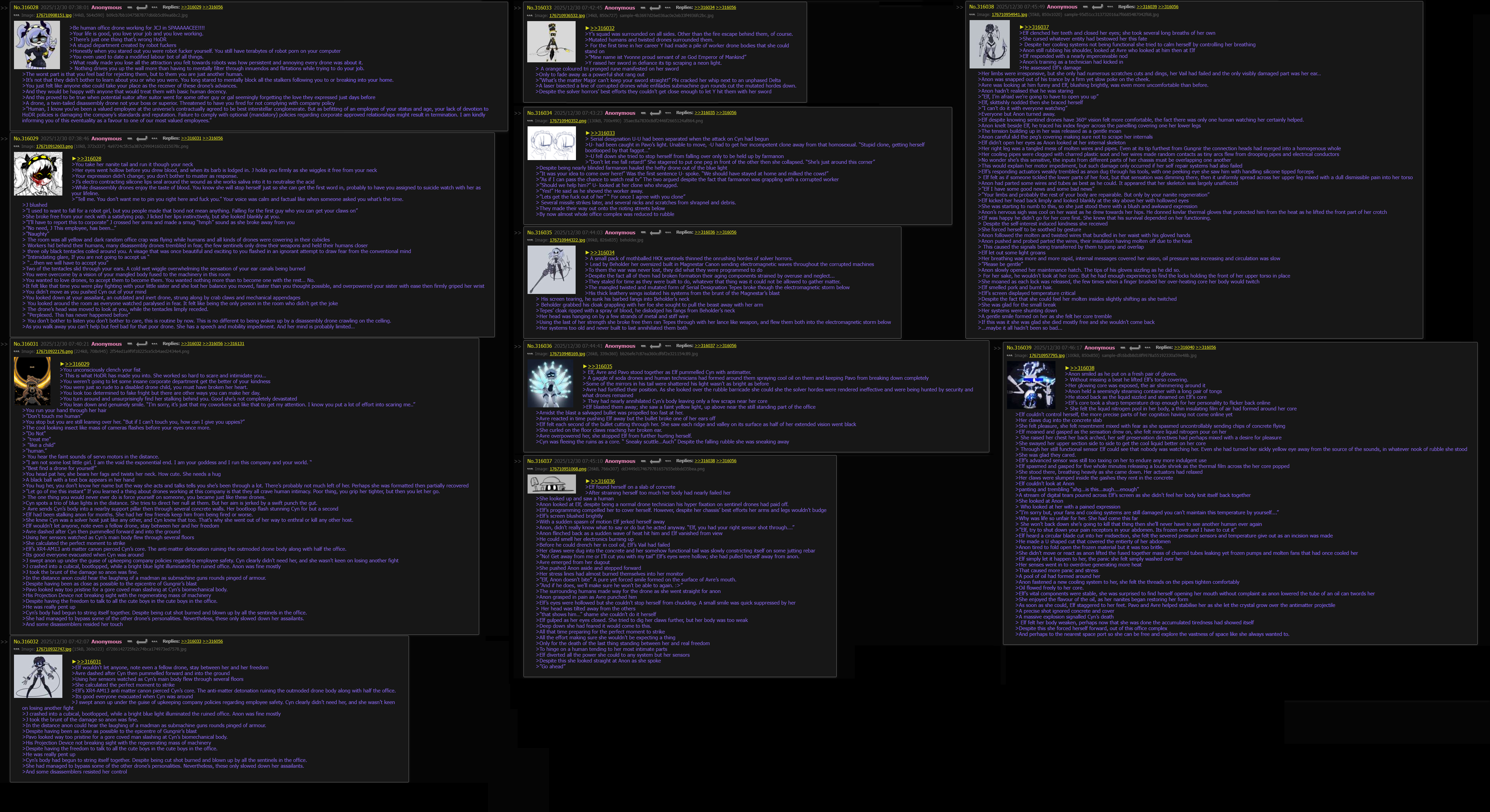 >>331755 >Cupidrone flew absentmindedly through the frozen forests of copper-9, past the cities and the cracked rock, she had flown for nights not encountering anything interesting >Eventually she looped back into the city >She mustered up a hastily made imperfect and unsatisfying hologram of one of the mountains before quickly deleting >She had to resort to salvaging oil from old spires and cans as she hadn’t run into anyone in a while >Normally she’d cleave some from the disassemblers that tried to mess with her, or some of the drones she ran into >But for a while now she had noticed a gradual increase in her more feral coworkers >Other than the odd few like that squad with the worker drone medic, that other pink eyed drone and her rapist goons, and that cute almost couple she should totally nudge together and their excentric major. >Most of the disassemblers she ran into were little more than mindless machines, they bored her as they fell for her holograms even more that the workers did >Of course there were others, but these were the ones she thought of, she couldn’t get herself hung up in melancholic drivel. >The spire of J’s squad was coming up over the horizon >She hadn’t seen or heard from them in quite some time, so she wondered if they were around in some capacity or another >She entered the spire through one of the access holes, at least they weren’t dead as there were recent-ish corpses lying around. >There wasn’t any activity in the spire so she entered their landing pod to see if she can find something about >Noting out of the ordinary save for a drawing of their pod with purple flames and text she didn’t bother to read >That was enough for her, so she left the spire to look for oil elsewhere. Perhaps she’d bump into them outside >She was conveniently distracted by a blonde drone entering a drone dealership while typing on her phone >Cupidrone landed on the roof, she sliced the lock of a rooftop access hatch and made her way inside. >She hovered through the high shelves that stocked spare parts and drone accessories, she’d have to take a close look at some time, but now wasn’t the time. >Eventually she found some cans of oil, she carried one in each hand as she creeped up to the source of the typing sounds >Lizzy, kicked a helmet with contempt, as she browsed the dresses section for something new to wear. Unsatisfied she took some with her to the changing room >The room had a high celling, vents, pipes and metal bars crisscrossed just like in a supermarket >Cupidrone looked at her phone from behind vent. After enough stalking she figured out that the girl’s name was “Liz” and that V had asked her to pick up some premium oil for her >Lizzy, looked up from her phone to acknowledge the flat figure before her, the distorted image of Serial Designation V was tinted pink and flickered as any simple hologram would >It spoke “Yo, Lizzy wanna have some fun!” >”Geez, gross. And since when have you gone back to speaking like that” >Cupidrone fizzles the hologram out after Lizzy turn her back to it but not before Lizzy snapped a photo >”Killer figure though, who’d you have to kill get flat like that” Then she goes back to texting on her phone >Cupidrone enjoys the novelty of drinking oil as she watches the somewhat uninteresting drone make trips to and from the changing room >After she finished the first can of oil, she discards it on one of the metal beams. She was sick of seeing “Liz” try the same dresses over and over again >Cupidrone made her way out of the building, she flung open the hatch and lifted herself up. >Serial Designation V pressed a submachine gun against her pink hair >”Who are you? And what were you doing with her?” V frowned as Cupidrone fidgeted with hands, sloshing the oil inside the metal can. >Blushing she mumbled a response “…. I was just having fun with holograms..I wasn…” Cupidrone was started as V interrupted her. >”Leave her alone.” >Without thinking even though she intended to leave anyway she responded “No” She rapidly shook her head >”Fine do whatever you want, like I give a dam” V pulled away from the hatch, allowing the pink eyed murder drone to access the roof >V took the can of oil from her, and she didn’t protest, she’d grab another one when she comes back to look for cool stuff >She watched V sit down at the edge of the roof, she could hear texting as she took off someplace else ____________________________