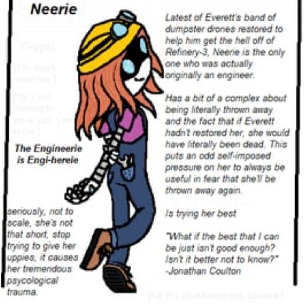 That's not even taking into account how both of these intersect with the effective absolute monarch/divinity being a "don't make me come over there" AND a "random capricious demands" type. Psudo nobility on the drones' part is all but certain but the way it happens? The industries developed around people that literally conjure things from thin air? The superweapons and hillariously impractical megastructures that Uzi herself will either order or just create from her mechanical autism and god powers? Fascinating to think about.