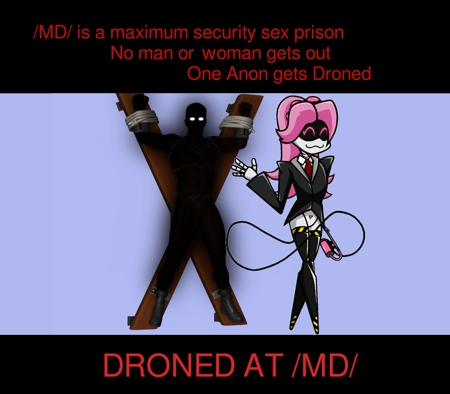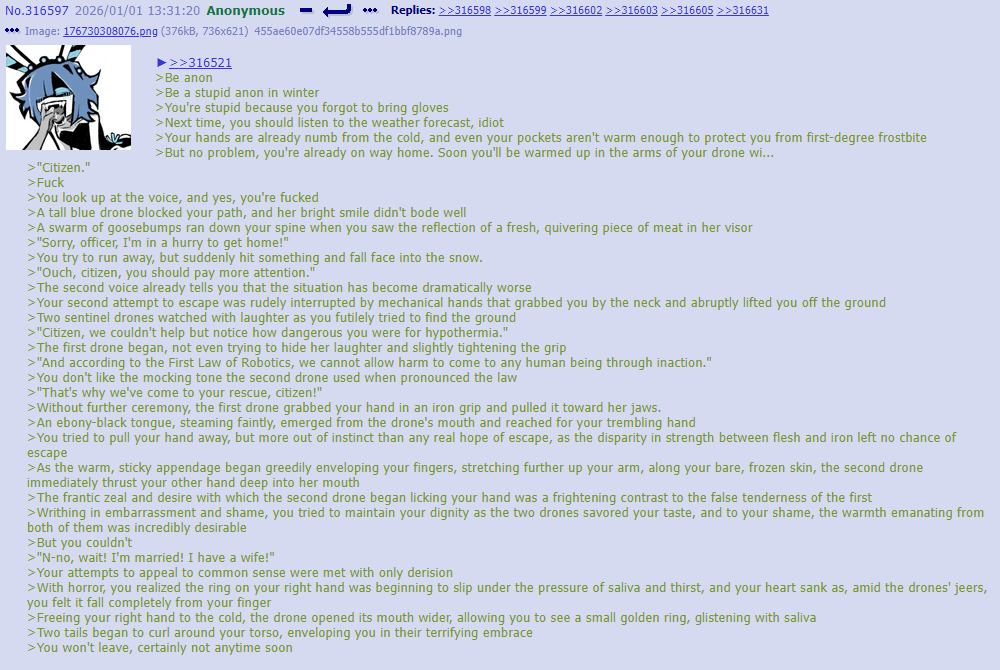 >Be Anon >High profile white collar criminal (Tax fraud/Money laundering) >Alright maybe not high profile >Maybe average at best >You recently got made, the media didn’t even care to mention you >Funny thing, you’re not being punished for the financial stuff you did >You’re going to the big house for breaching online safety laws >You posted some choice words online, you thought it was on a anonymous image forum but it was actually your Space Opinion Dispenser account and you have your government ID linked to that >So when you sent “Clankers don’t deserve rights and should be thrown into shredders” into the ether you inevitably summoned a squad of police drones into your house >The trial was interesting >The prosecution mostly focused on the fact you didn’t tale part the dronecel welfare… *Ahem* >State funded mandatory relationship creation program >You technically didn’t get sentenced to jail time the judge called it a “Social Adjustment Program” >Technicalities don’t change the fact you will be spending the next week in a jail cell >Sadly your defense of “I’m not racist some of my best friends are drones” didn’t work >And you got slapped with an extra fine for lying about having drone friends >You didn’t even know there was a fine for not being friends with drones >Whatever, your sentence is only a week and your finances aren’t really affected, even with the fine >But if they keep slapping you with those fines you’re in big trouble >And you’re probably on some sort of registry so finding a job might be a bit hard once you get out >You’ll worry about that later, right now you’re in a prisoner transport en route to the detention facility you’ll be staying in >The truck eventually stops >The door to it’s back open and the convoy guards tell you to get out >You do, and they begin escorting you to the gates of the facility >Near the entrance two Police drones meet your human captors “Hey boys! You brought us a new friend I see! So nice of you~” >The guard behind you pushes you forward a bit and into the open embrace of the police drone >She starts hugging you >It feels almost nice for a while but the sudden sharp pain in your neck really ruins it >She has just stung you with her tail >What was that for!? “Oh stop wriggling! It’s just a tracker! We wouldn’t want you getting lost now would we?” >The human guards hand some sort of document to the other drone “Thanks! Listen guys maybe you’d like to step in for a while? We can make you cookies~” >Both human guards begin hastily making excuses, from the parts of their faces that aren’t covered with their helmets you can see they are filled with dread >The guards part ways and you’re left alone with the police drones >They turn to you “Oh… they never stay… shame, those guys are hunks!” “Yeah, but at least we have our new inmate” >They both give you wide smiles >The doors to the building open and you’re led inside >The inside is about what you’d expect, varying shades of concrete gray on the floor, walls and ceiling >But there is a lot of posters on the walls to break up the monotony >They are propaganda posters of course, a few catch your eye >“Drone kisses make you free” >“Drone hugs make you free” >A poster explaining how to clean drones >A poster explaining how to optimally pet drones >A poster with some clearly fabricated statistics how having more drones in your life increases it’s quality by 1000% per drone >A poster telling the inmates to prepare for something called a “Drone Day” >And lastly a poster with a head a drone on it >Well they all had drones on it and they were all in various states of undress >This one has all of her clothes on though >She’s giving the viewer a wide smile and pointing a finger at them “The warden sees all” is written below the drone >The phrase is concerning enough but the smile… >It looks honest enough, but you can sense a predatory nature behind it >More predatory than usual with non worker drones >The drones lead you to a cell and open the door >They take off your hand cuffs and tell you to get inside >You quickly look at their name tags and try to memorize them >You read somewhere this is a good idea in case of any police brutality “Serial Designation – XB-10001-245B” And “Serial Designation “GL-25525-2432” “Stay here while we process you” >You enter your cell and the door shuts behind you >The cell has two beds, there is a man sitting on one of them >He is curled up in the fetal position, rocking back and forth and mumbling to himself >It looks like he hasn’t noticed you enter >You walk up to the man >He is still oblivious to your presence >You place one of your hands on his shoulder >He jumps in place and tries to retreat into the wall behind him >He stops and looks at you for a second >You look into his eyes >He looks positively deranged >The man grabs you by the collar of your shirt and pulls you closer to himself “Listen! You have to get out of here! They… They… Oh it was horrible! I can’t take any more!”