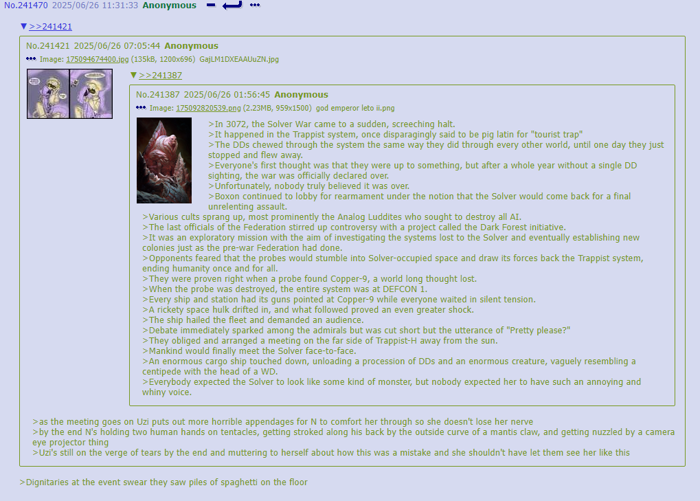 >>332365 NGL this is me but for the Empress Uzi stuff. It's neat to wonder about how would drone civilization develop if it had to suddenly structure itself around the appearance of thousands of supermen and a few physics-breaking near demigods, alongside all their particular pet flesh-horrors(as opposed to the regular post cannon where most everything's explicitly structured as "drone UN"). It's even more neat to think about how the Human civilization responds in turn to having actual diplomatic channels with not just an actual eldritch divinity, but one that was effortlessly ripping through them hntil a few years ago.
