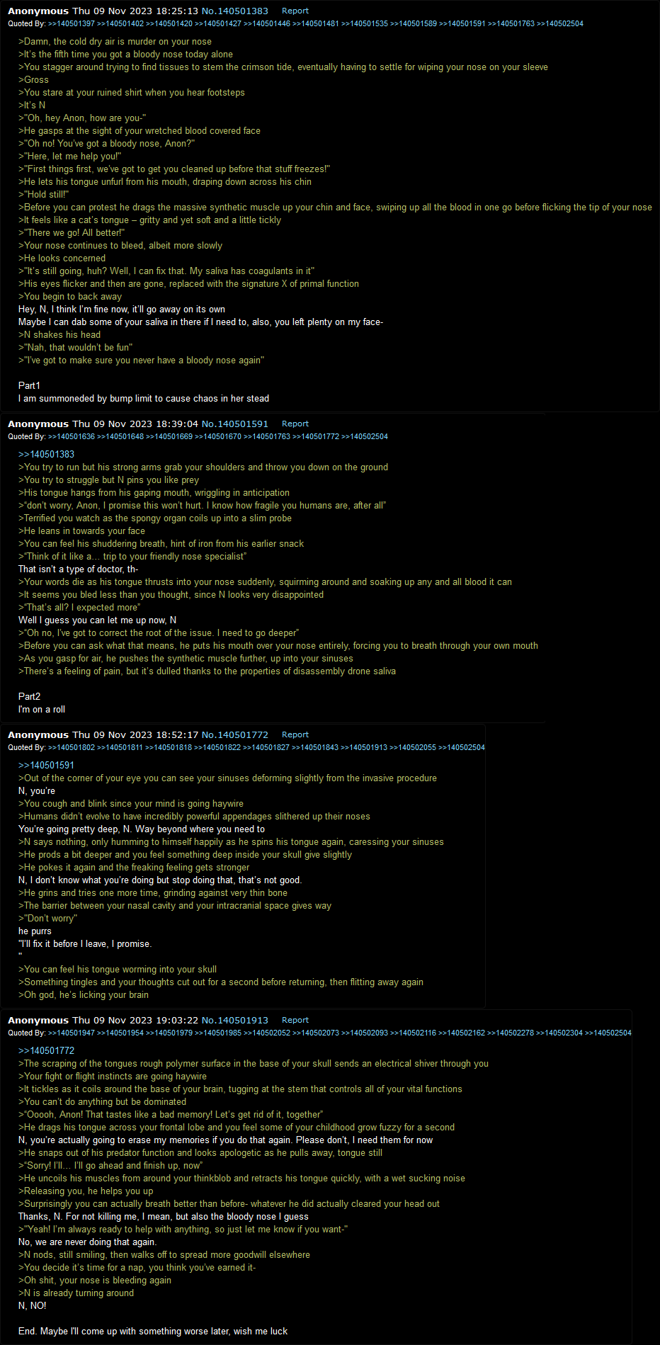 >Cyn can't move >She did her best >But James didn't care, she screwed something unimportant up >So he grabbed her by her neck and threw her down a flight of stairs >Cyn can't move >Cyn can't move >Cyn can't speak >Cyn can't cry out to the drone dragging her by her mangled leg to the drone pit >Cyn can't cry and beg for him not to do this >Cyn can't cry is terror as she's unceremoniously thrown down into the pit full of drone corpses >Cyn can't cry as the pit starts to collapse on top of her, burying her beneath a mountain of bodies >Cyn can feel her core shutting down >She can feel herself dying >And as she's dying, she feels something rap tap tapping on the walls of her mind >And she lets him in