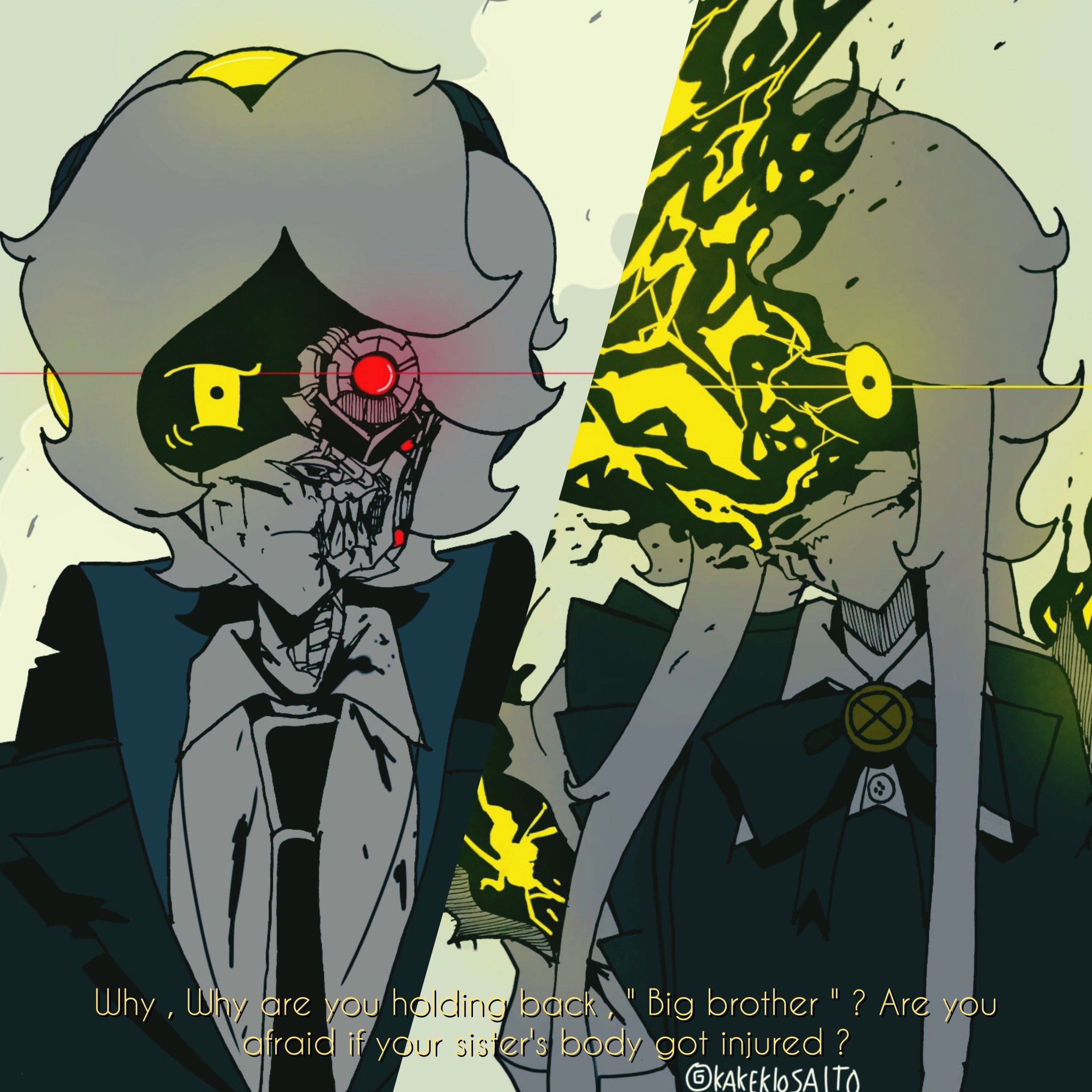 >As fate would have it, V does in fact find Solver!Beretta first >At this point Beretta is acting like a terrified & cornered animal, being made all the worse by Auntie Cyn's malicious/misguided warnings that V was planning to kill her >V is at a crossroads over what she should do in this unsettlingly familiar situation, and for a tense moment it looks like things will play out just like the fight she had with Uzi in the woods all those years ago >Without warning Beretta charges, forcing V into motion & causing both of them to clash somewhere in the middle >Yet in spite of Beretta causing serious (but not quite fatal) damage, V chose to try hugging & talking her niece down rather than fight >Between the competing voices of her aunts Beretta inevitably sides with V's words of reassurance over Auntie Cyn's ranting and raving >By the time Uzi, N & others find them Beretta has at last calmed down (although she's still a bug monster) whereas V is knocked out/powered down from oil loss