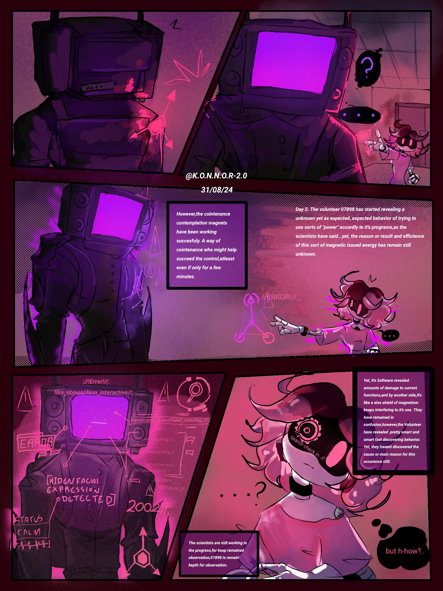 >Uzi gets tired of the stupid pizza song in the back of her head >She reaches into the depths of the Void with her crazy centipede tendrils and smashes the infinite pizza box Original Cyn is eating from >"We had a deal," it says in a hurt voice >"New management, deal's over!" Uzi replies before leaving it, drifting alone in the void >She returns to her "normal" life, chatting with N before class >The lights go off, leaving the two in darkness >Uzi sets one of her Solver cameras to flashlight mode, illuminating an empty hall, a trail of oil where N was >She follows it and finds him, face frozen in horror, his chest split open, and... some kind of grain growing out of his innards >His core's fine, if terrified, and Uzi's about to ask him what happened when she hears gunfire >V is backpedaling down a hall, shooting at something, before being grabbed and hoisted up >By the time Uzi catches up to her, she's covered in red fruits >A worker drone flees down the hall at impossible speeds, and she gives chase on her two-toned wings >It leaves the outpost, the bunker empty and the doors open, running on foot faster than she can keep pace with her wings >She loses it, but hears a shriek in the distance, and follows it to a half-repaired pod >J is lying in the snow, her dress torn open >Dear Robogod, she's been milked... >Uzi's tail chimes in >"You made a mistake." >"Shut UP, Cyn! I'm gonna paste this freak!" >"Tomato paste?" echoes that drone's voice, and Uzi turns, blowing up a building in the direction it came from >She approaches the rubble, which explodes as the drone flies past her at impossible speed, disappearing behind her- no, into her >Then she feels something slicing away at her >Cameras dart across the length of her true form, spotting the drone as it slashes her apart and thinly slices her horrid flesh before disappearing again >"Peeperoney," the voice says again, echoing in her brain until it's all she can hear, an endless cacophony >Uzi is left reeling in pain, even her eldritch form brought to heel by its bisection, her senses fading >She awakens in her bed in the outpost, N looking at her with concern >"Are you okay, Uzi? You started screaming about pizza." >For the first time since she took this position, Uzi looks scared >"Yeah, N... I'm fine. I had a nightmare." >"How can you have a nightmare about pizza?" >Uzi gives the dork a hug, and he pats her on the back >She hears that song start up again >But now she knows better than to break the deal