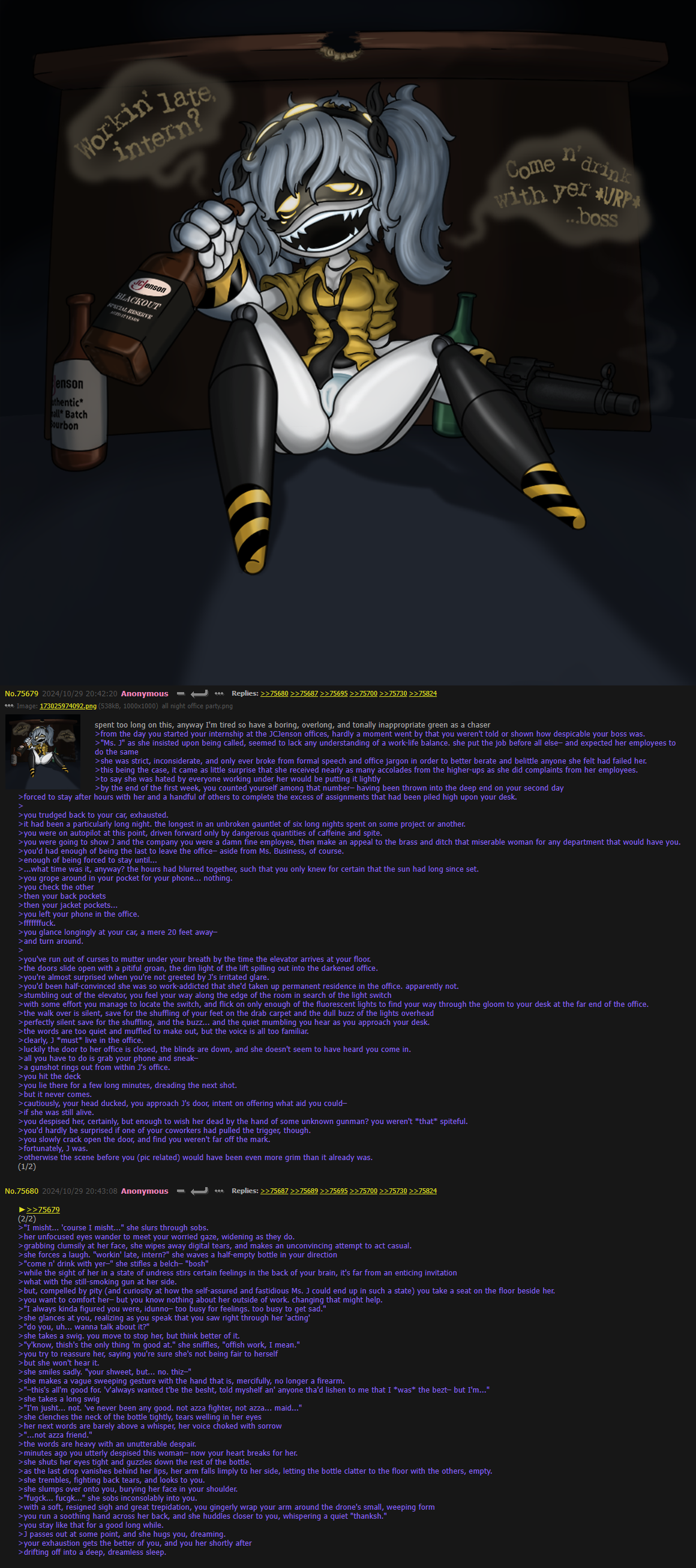 >>341132 >J can still ingest alcohol >J can no longer remove alcohol from her oilstream >J did not realize this until it was too late >Now Anon must handle not only the liver's matchmaking attempts, but also a perpetually drunk J with no filter and no sense of personal space as she putters about the office "working" >Worse: he must maintain the illusion that she's coherent to both management and the rest of the team. >At least if he doesn't want her to lost her last tether to meaning in life by getting fired