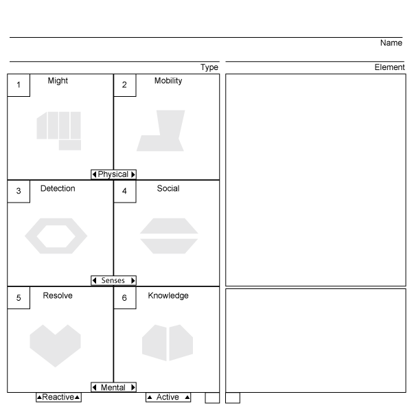 >>341470 The statistics have numbers in their corners Might 1, Mobility 2, Detection 3, Social 4, Resolve 5, Knowledge 6, the big number represents the base value that gets modified by the second dice