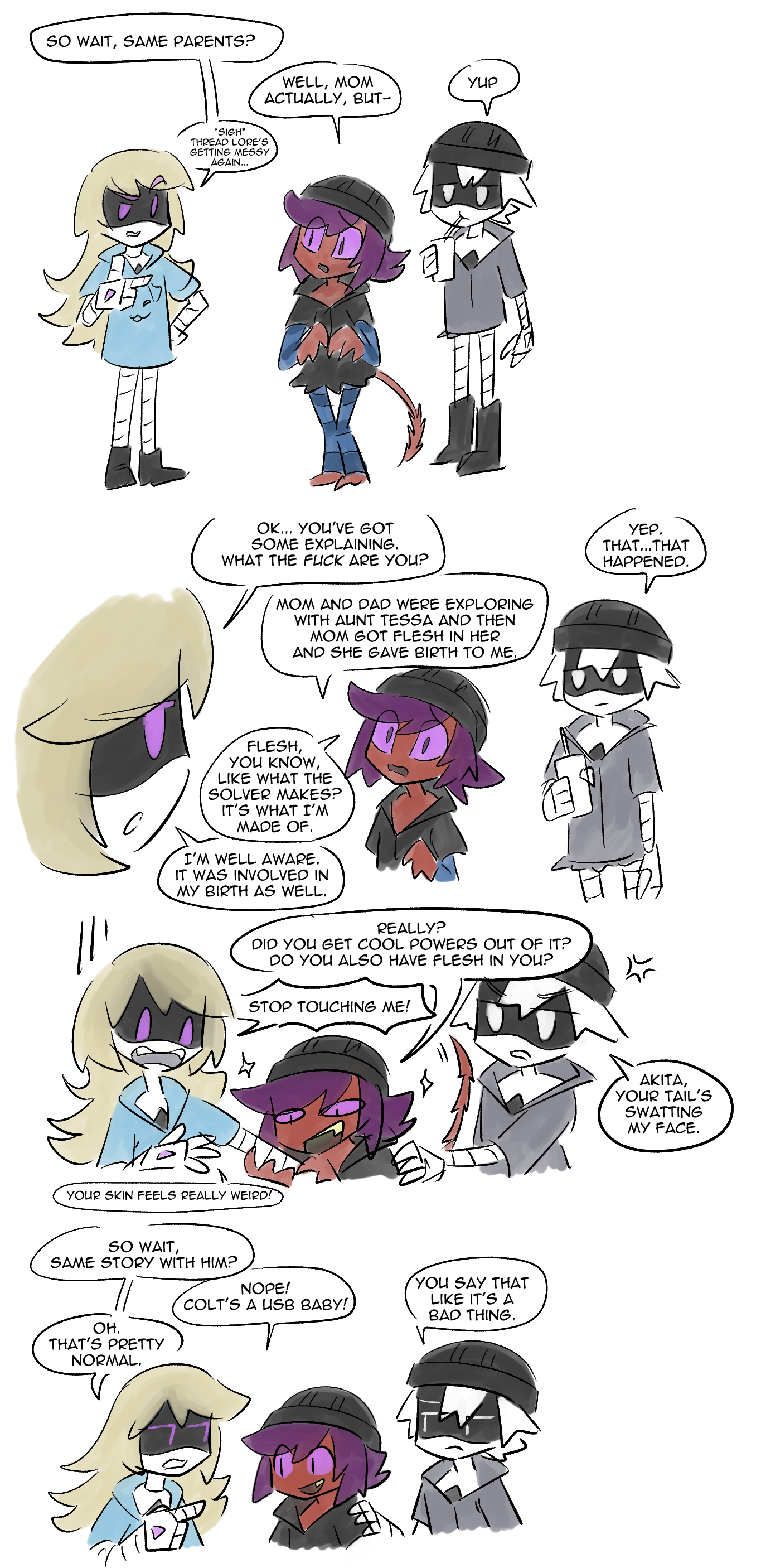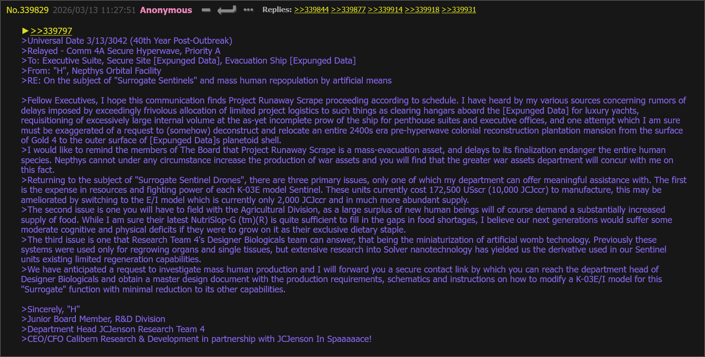 There will be more, I'm just getting sucked into the infinite overtime void so my weekends have been flattened. I can answer questions I don't think will spoil upcoming parts, as that takes much less time and energy. I have plans for drone characters, but we need to give the humans more time to fuck this situation up properly.