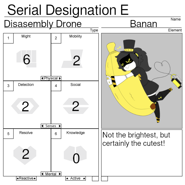Now for card creation rules You have 14 points to distribute to the statistics maximum 6 minimum 0 You have to pick a type : Disassembly Drone, Worker Drone, Solver Witch, Sentinel Drone, Grunt Drone, Zombie drone, Human... more I guess? Maybe we could work out a rock paper scissors or Chinese alchemy pentagram mechanic for it, pick something funny for the element I dunno